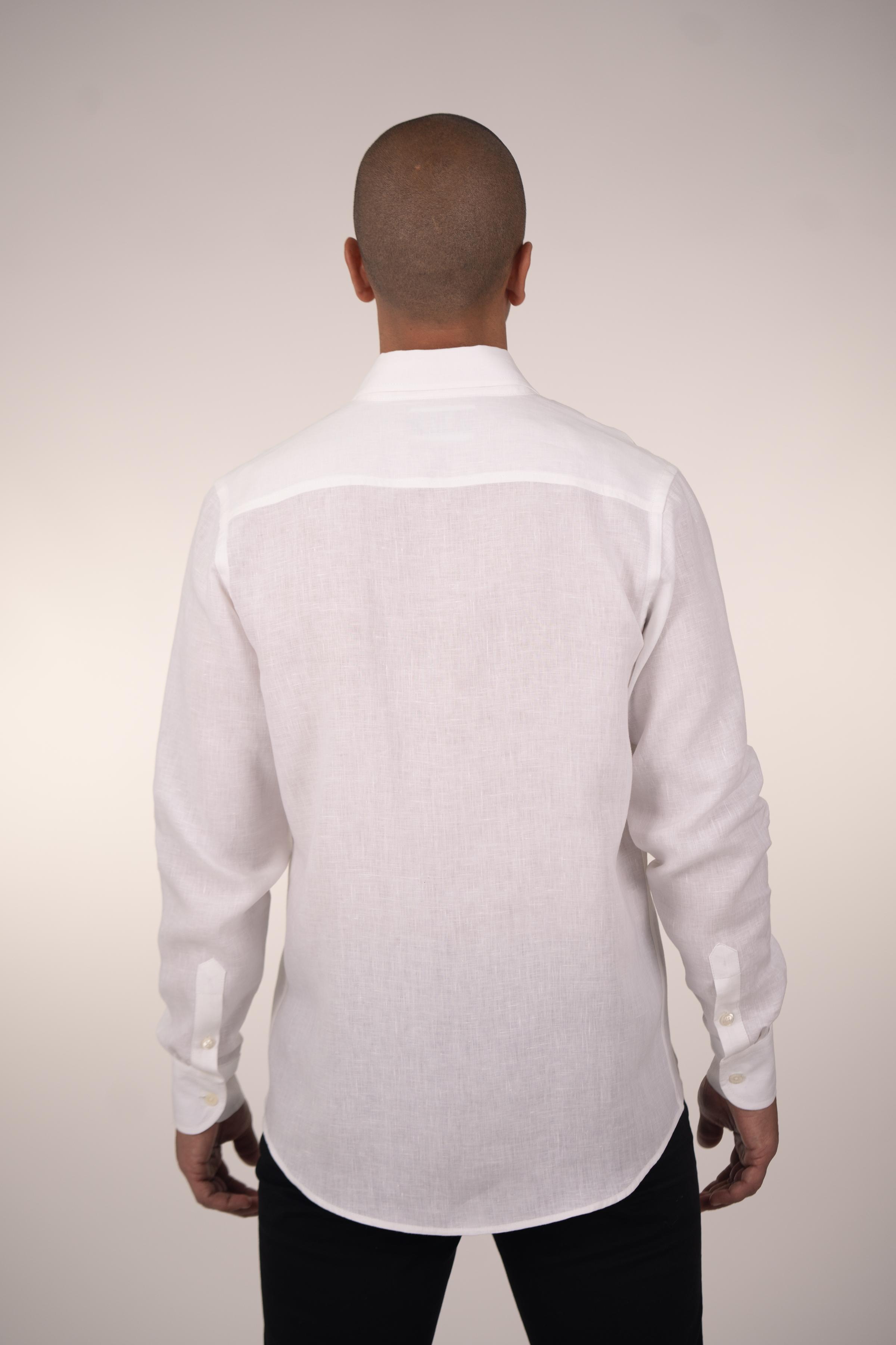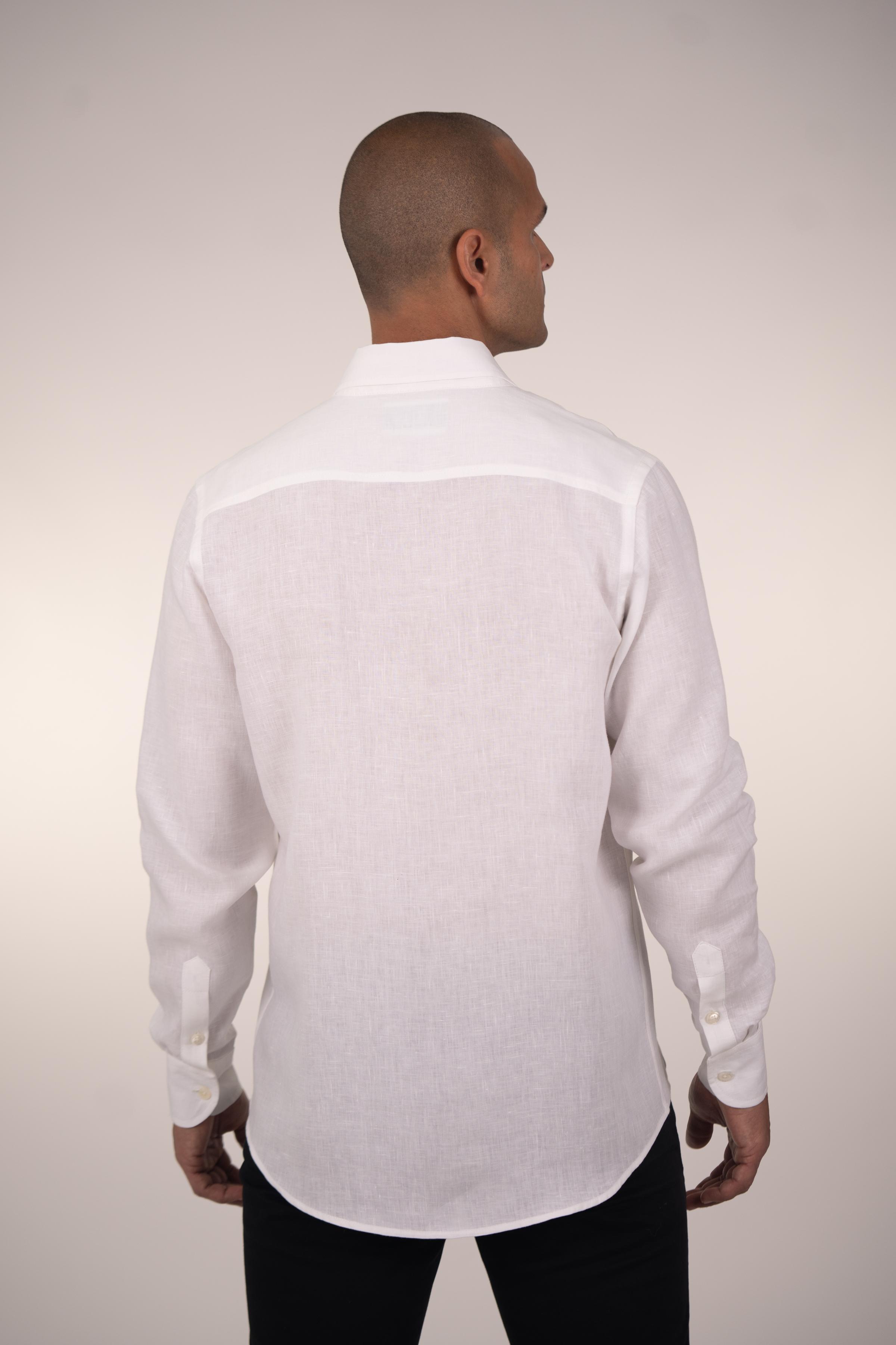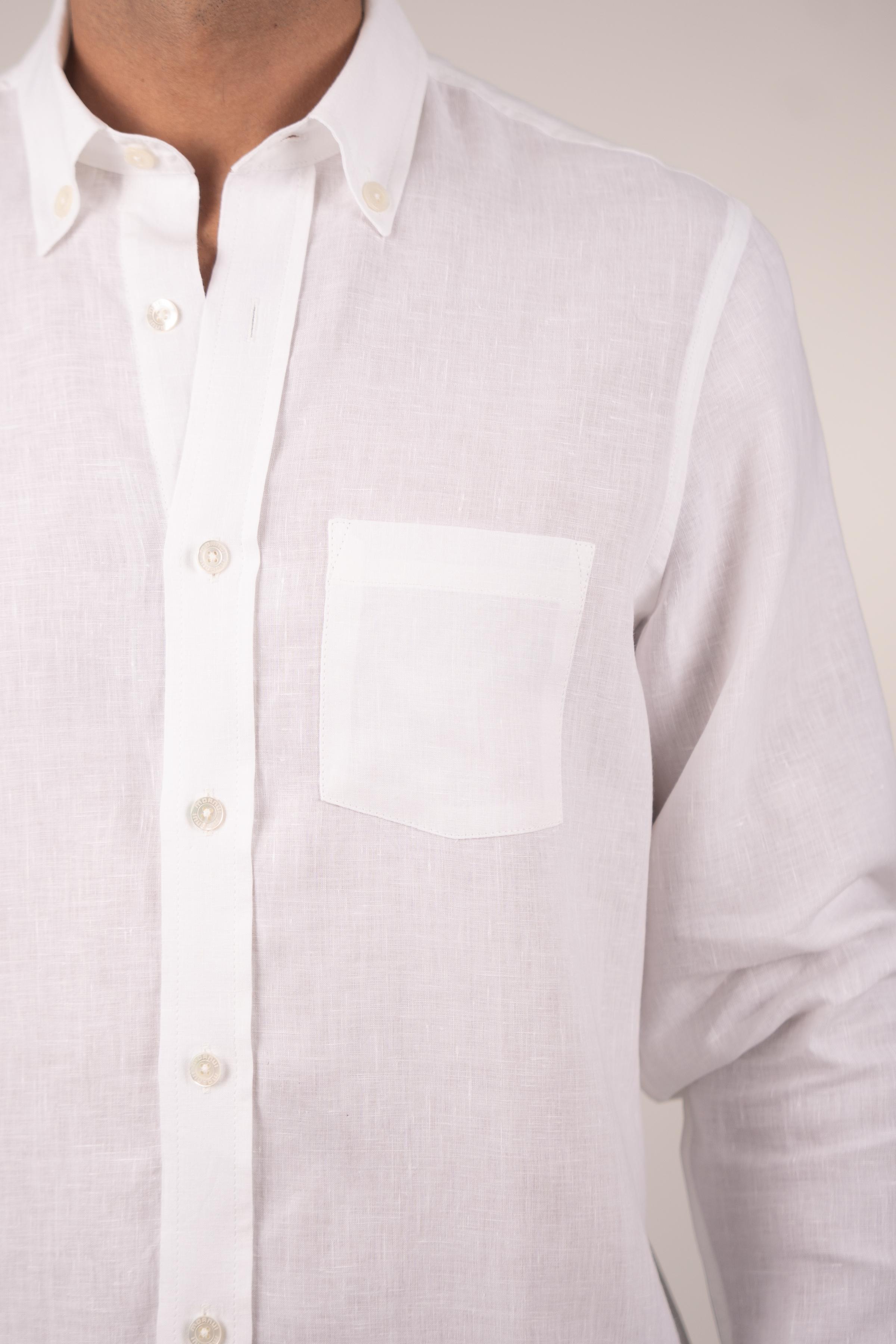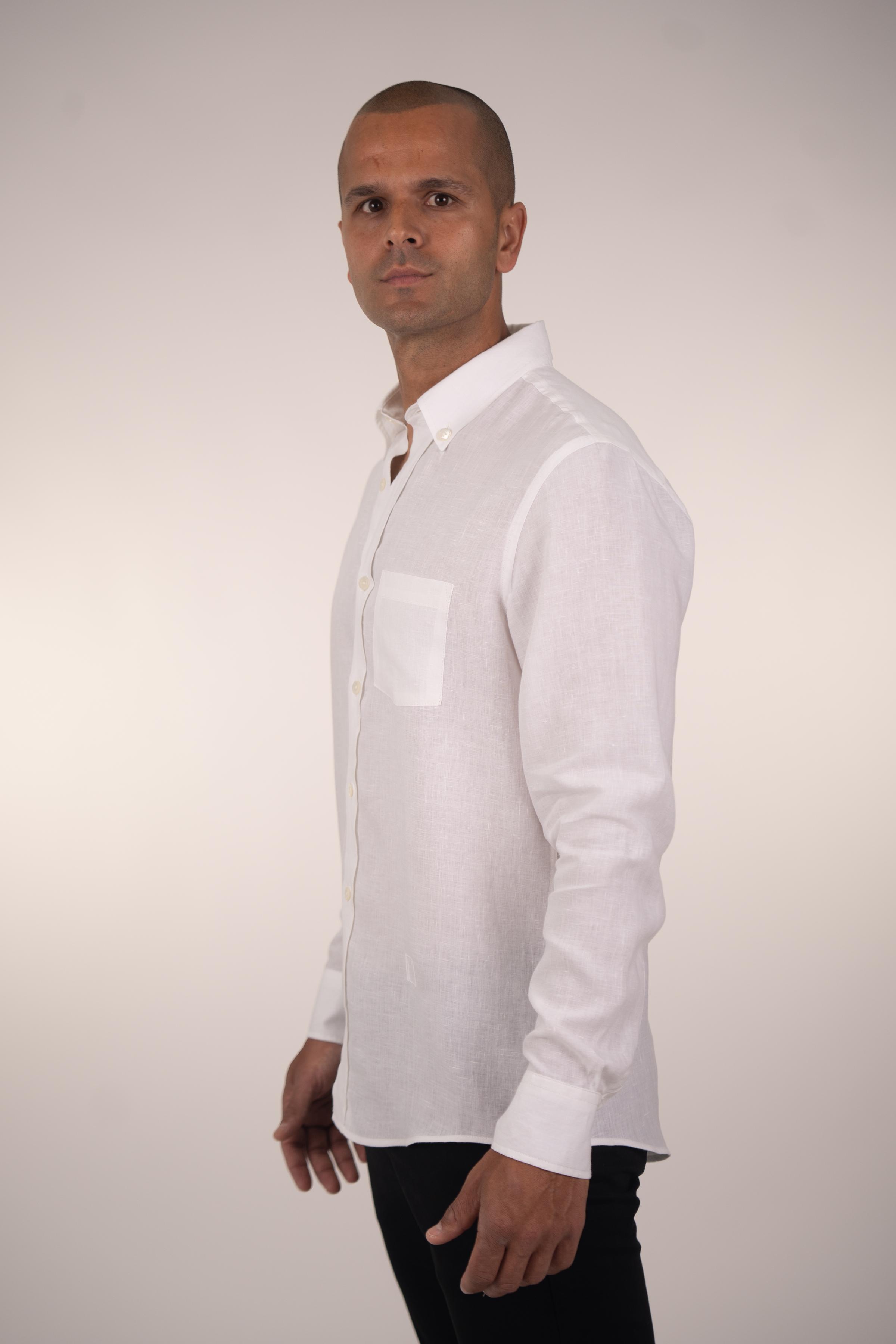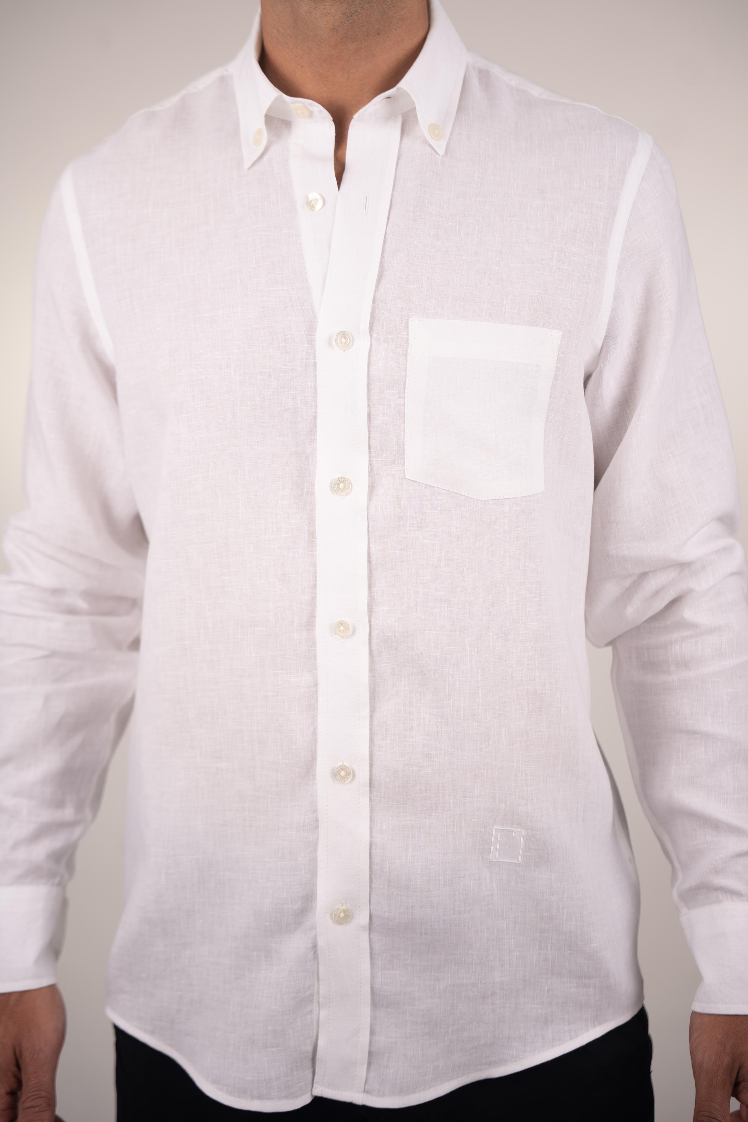 Long-sleeved shirt for men. Made of linen in white color, it’s a fundamental piece for your ideal wardrobe, providing comfort and freshness. Its regular fit makes it a simple, comfortable, and versatile garment. Featuring a button-down collar and a chest pocket with an embroidered MOANUI logo in the same tone.