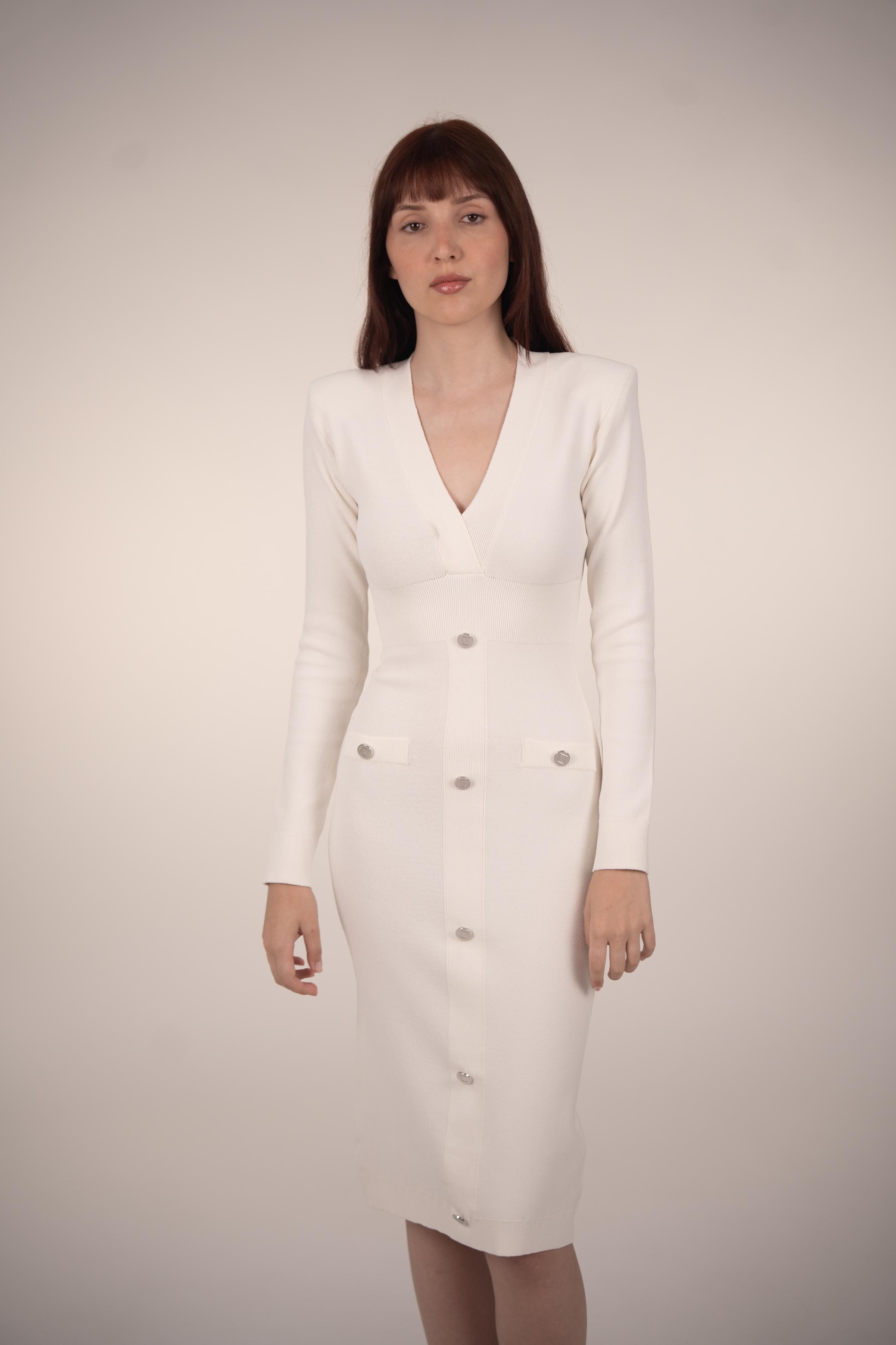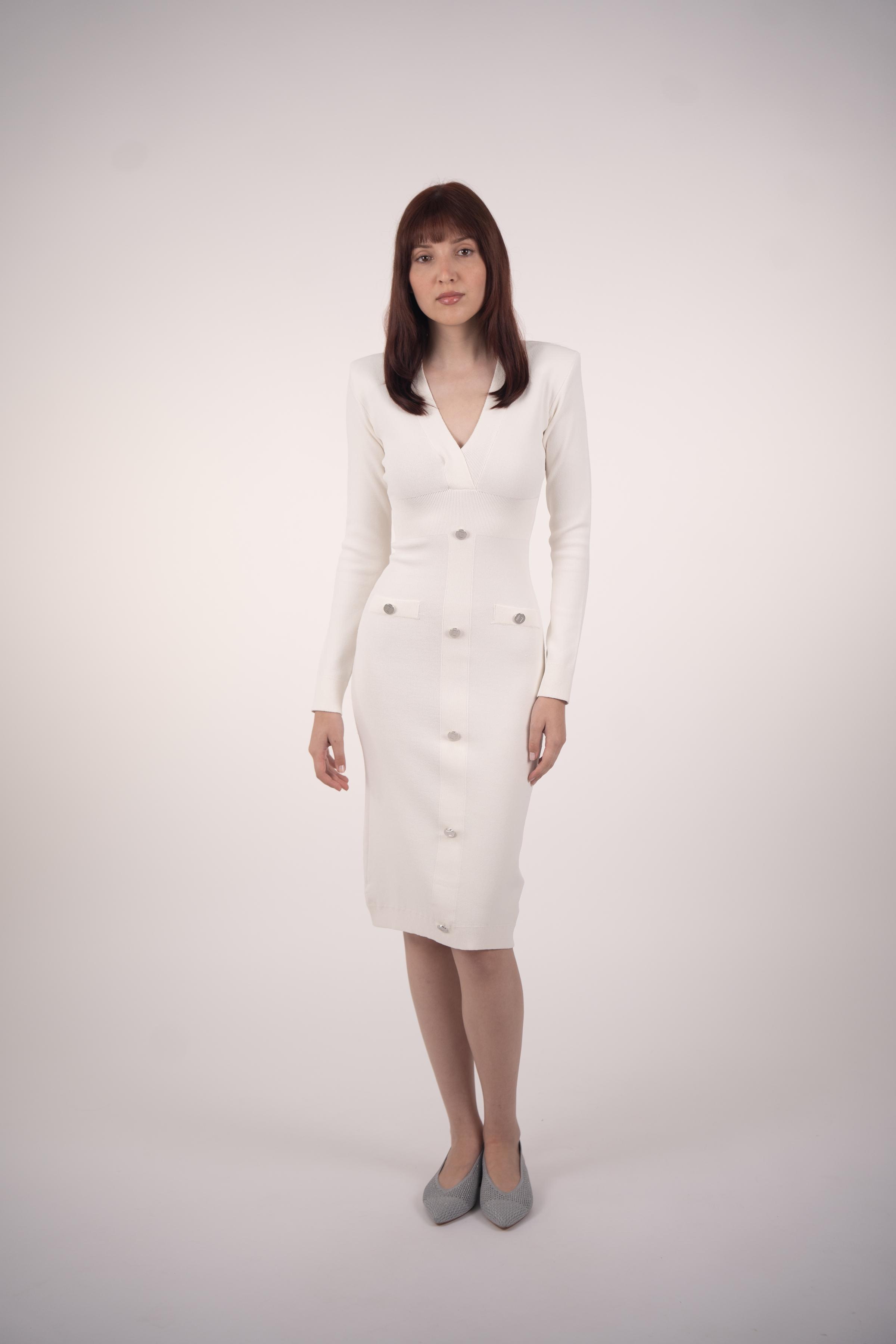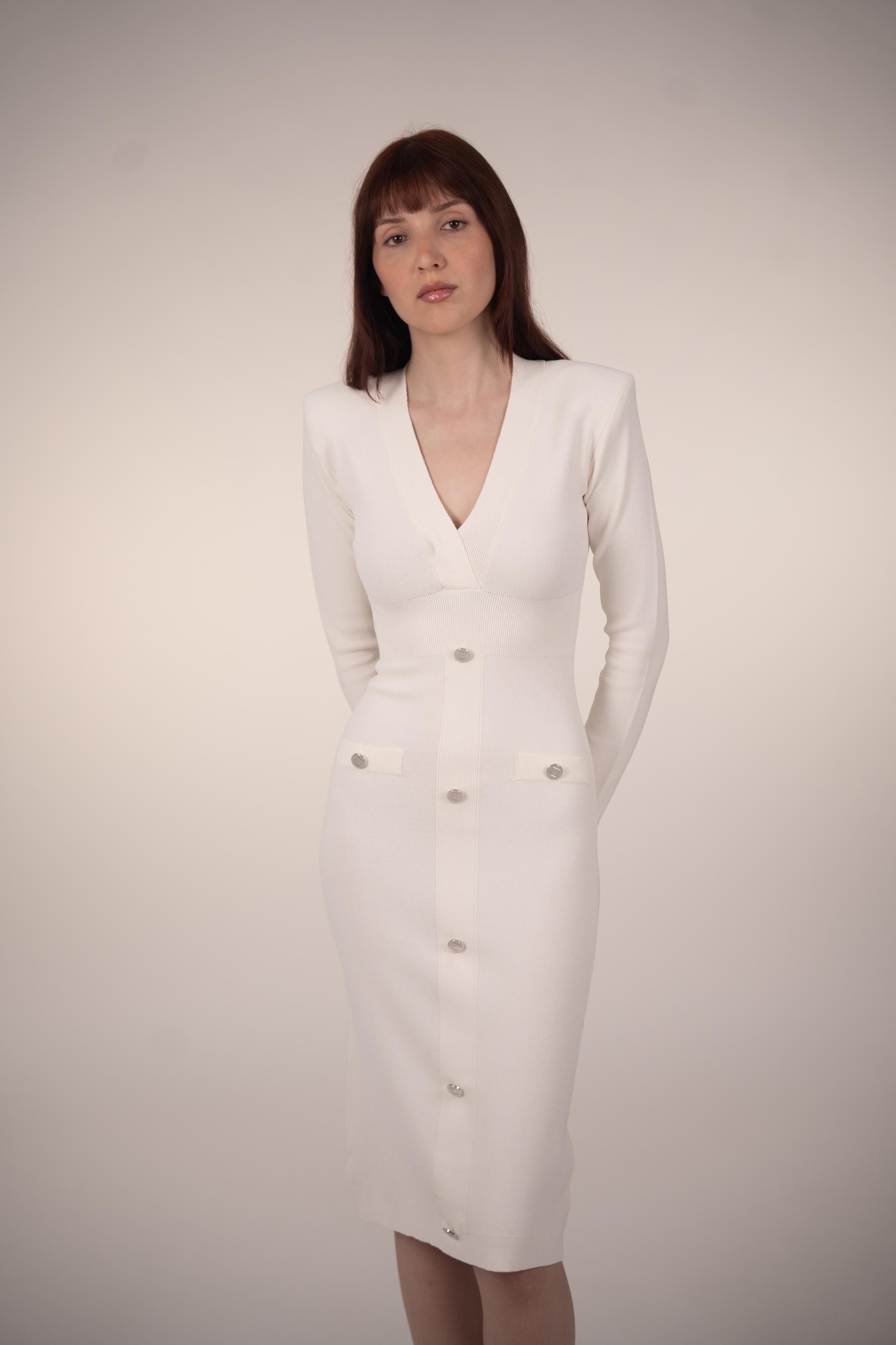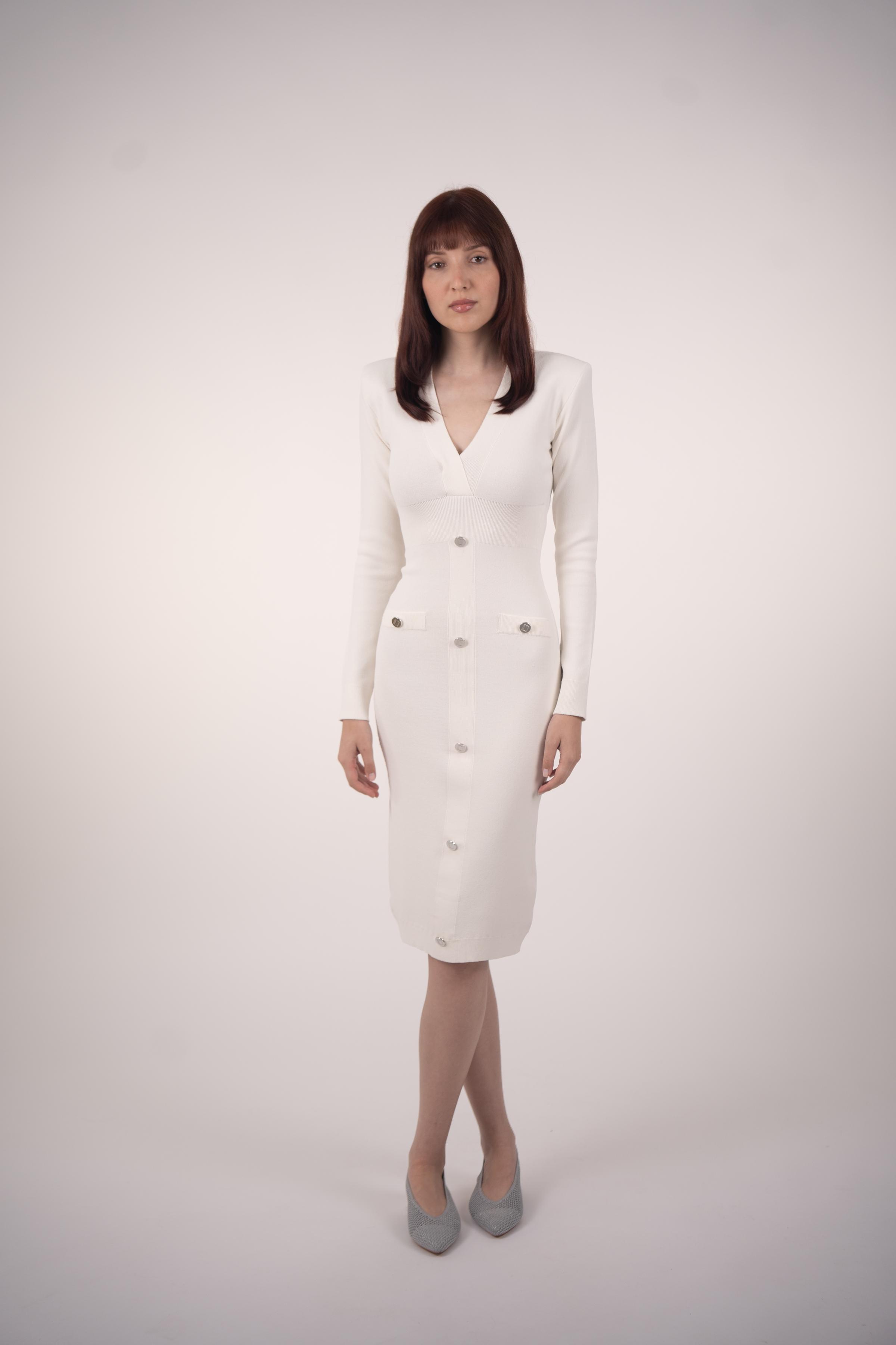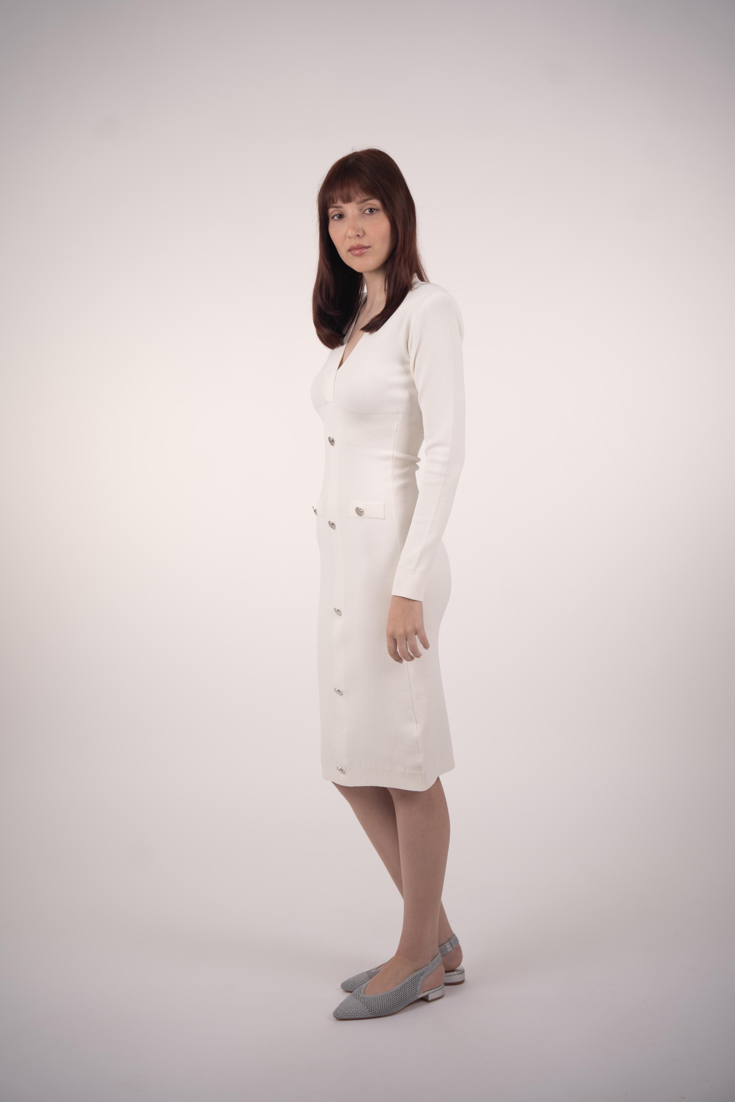 Step into elegance with our Classic Midi Dress in white color, featuring gleaming silver buttons that add a touch of refinement. Crafted with precision from premium materials, this dress combines 83% Matte Viscose and 17% Elite Polyester for unparalleled comfort and style. The finest Jolie Crep yarn enhances its distinction, ensuring you radiate sophistication with every wear. Perfect for any occasion, from casual gatherings to formal affairs, our Classic Midi Dress effortlessly blends timeless charm with contemporary flair.