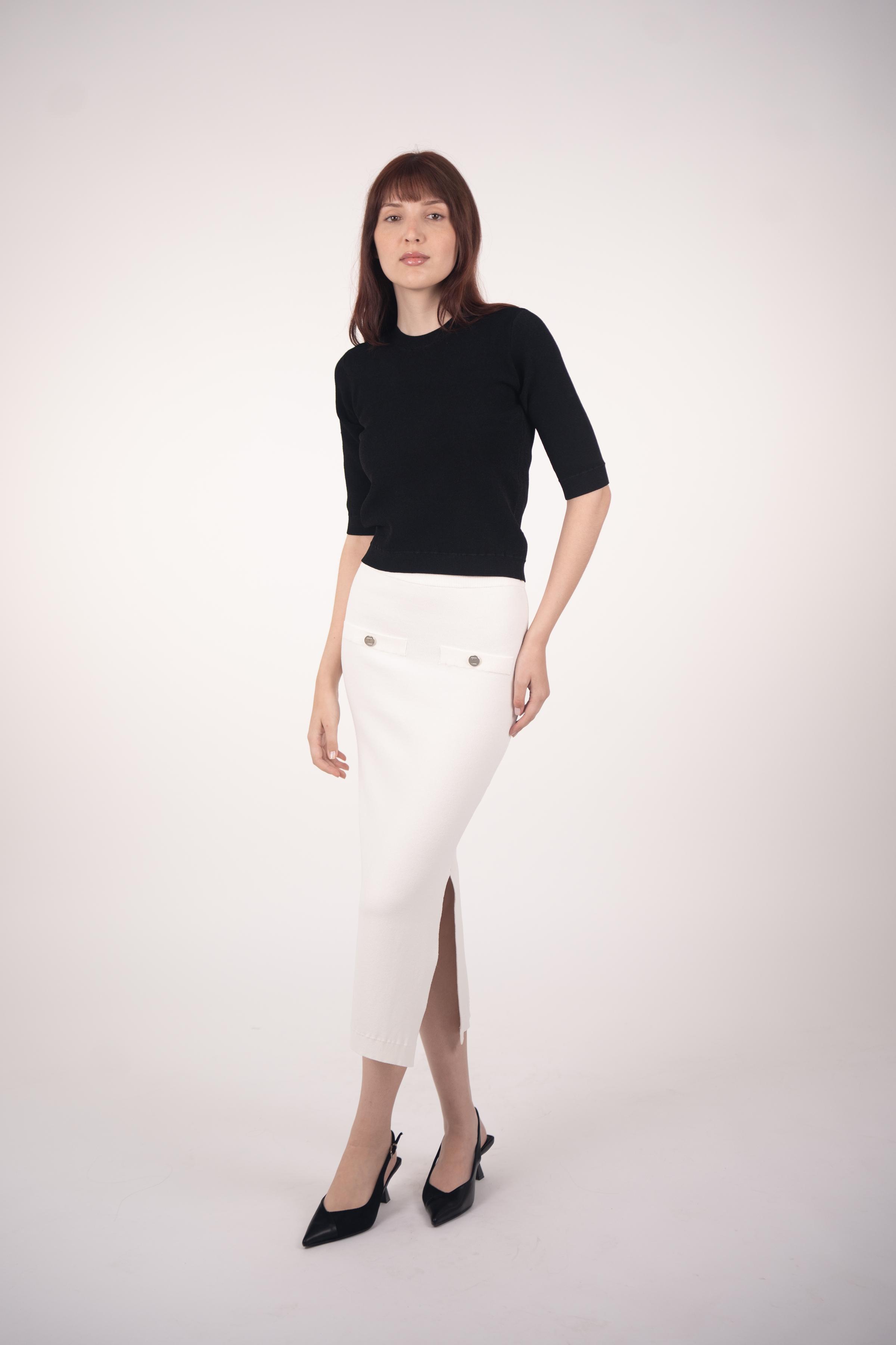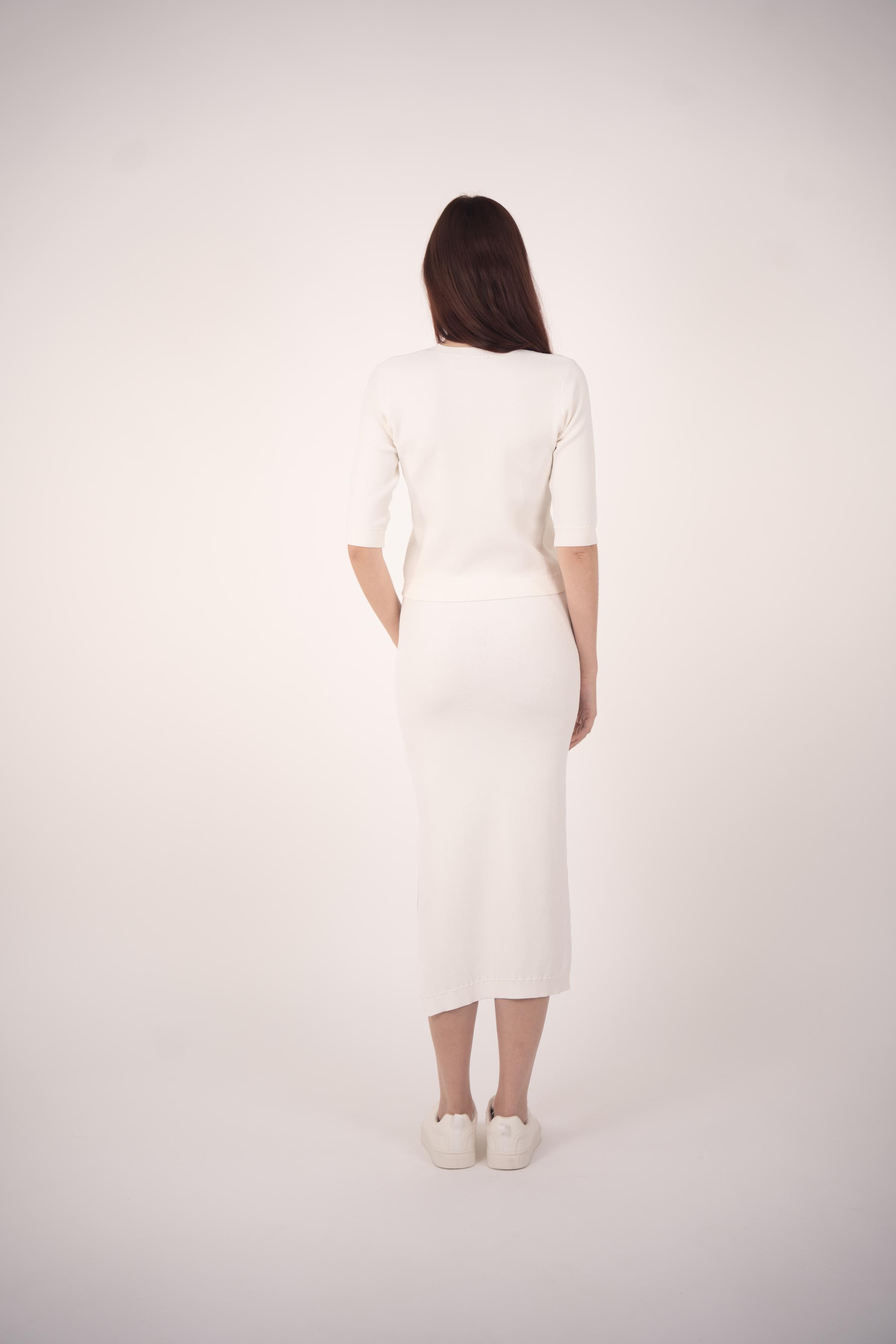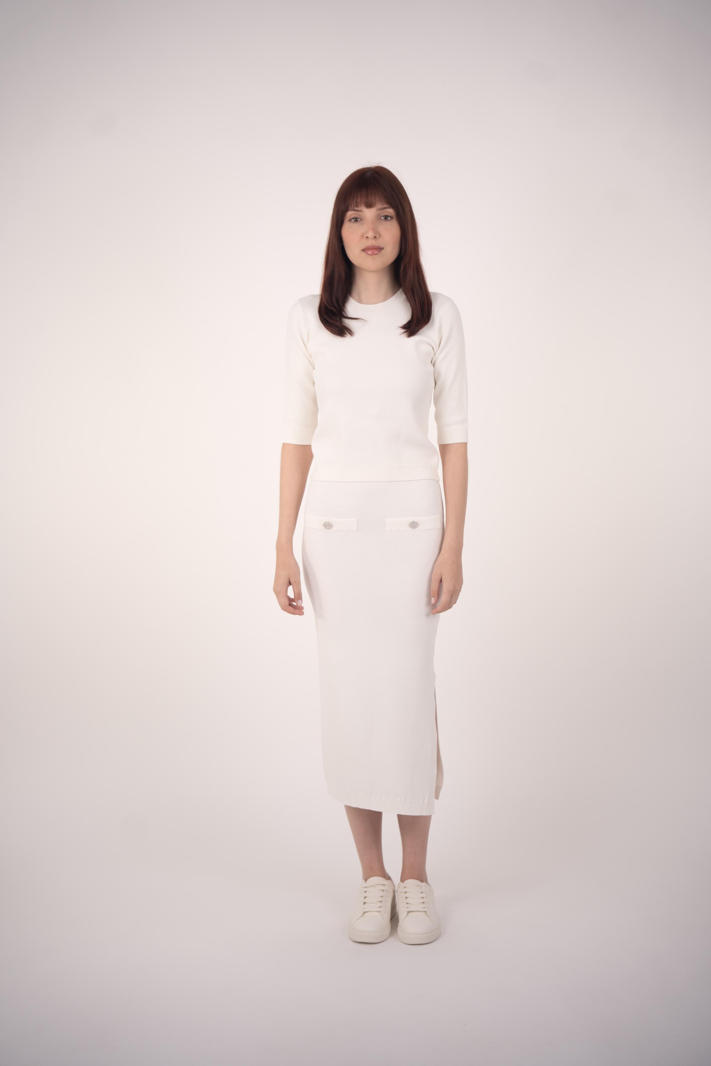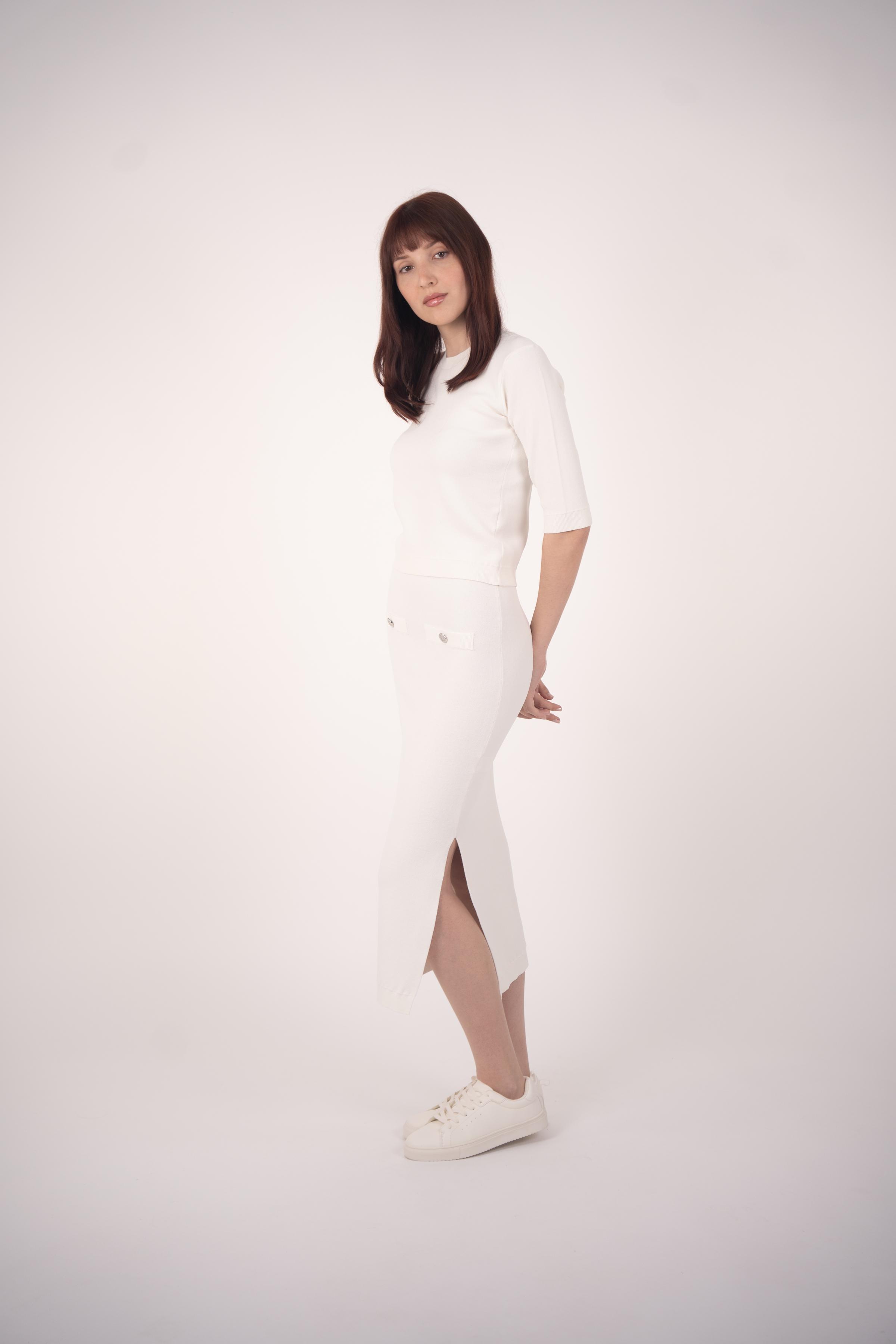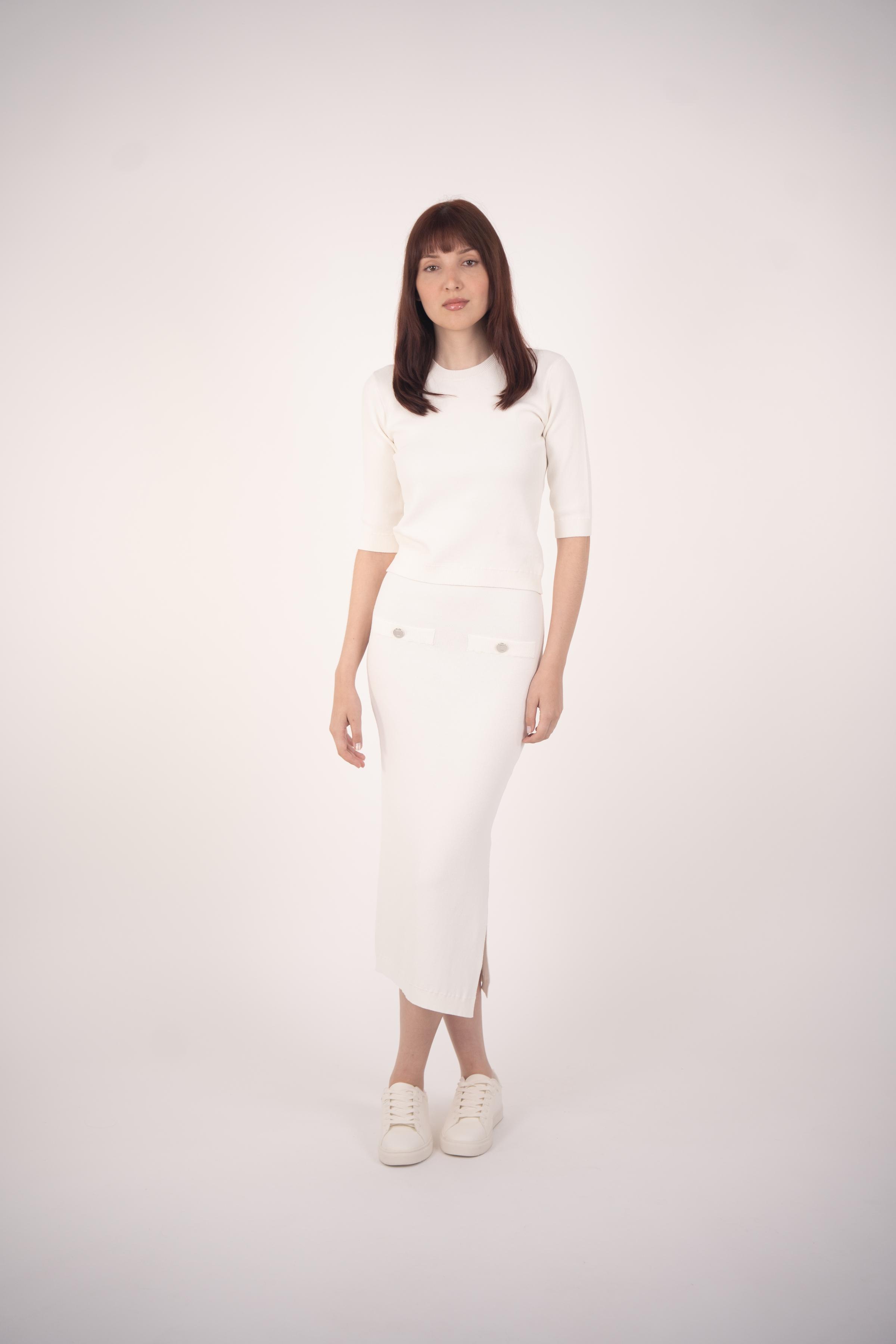 Transform your wardrobe with our Viscose Midi Skirt in white color. Each detail speaks of sophistication, from the shimmering silver buttons embellished with our brand’s iconic logo to the meticulous craftsmanship of the premium materials. Comprising 83% Matte Viscose and 17% Elite Polyester, this skirt promises both comfort and style. The finest Jolie Crep yarn adds elegance, ensuring you exude confidence with every wear. Versatile for any occasion, from casual gatherings to semi-formal events, our Viscose Midi Skirt seamlessly blends timeless charm with contemporary allure.