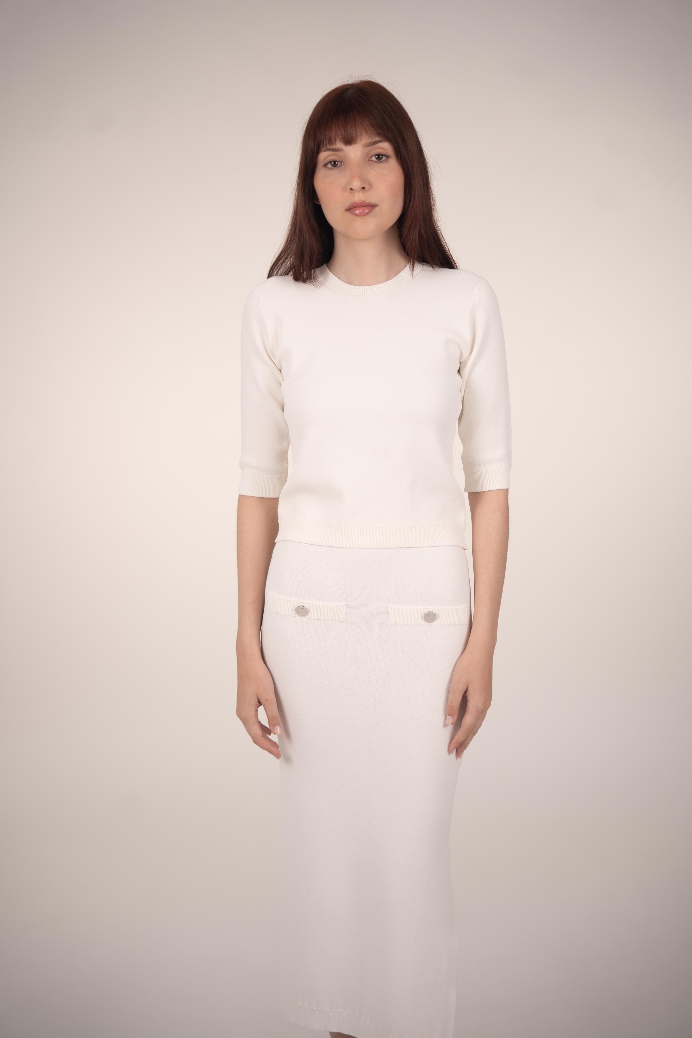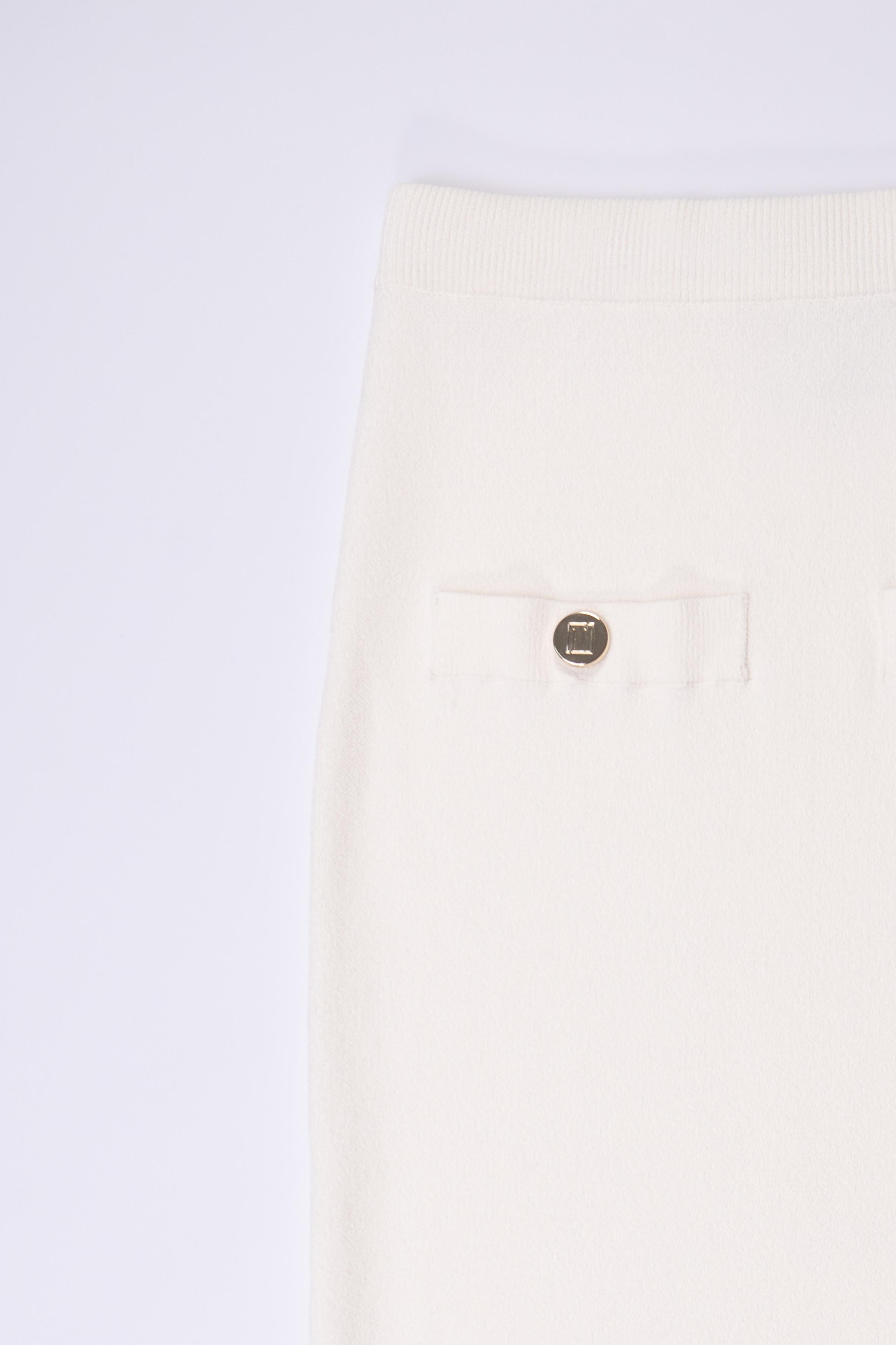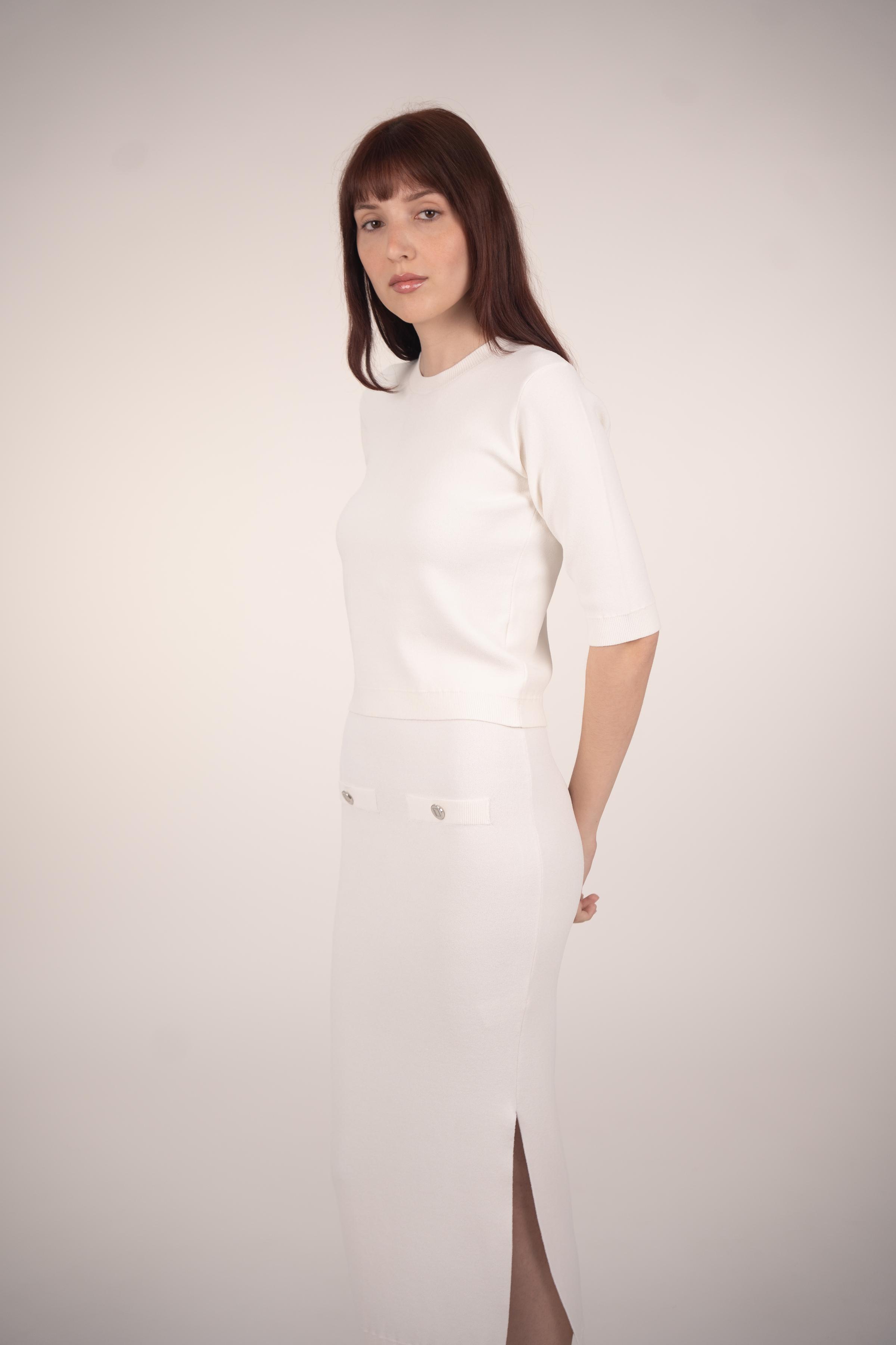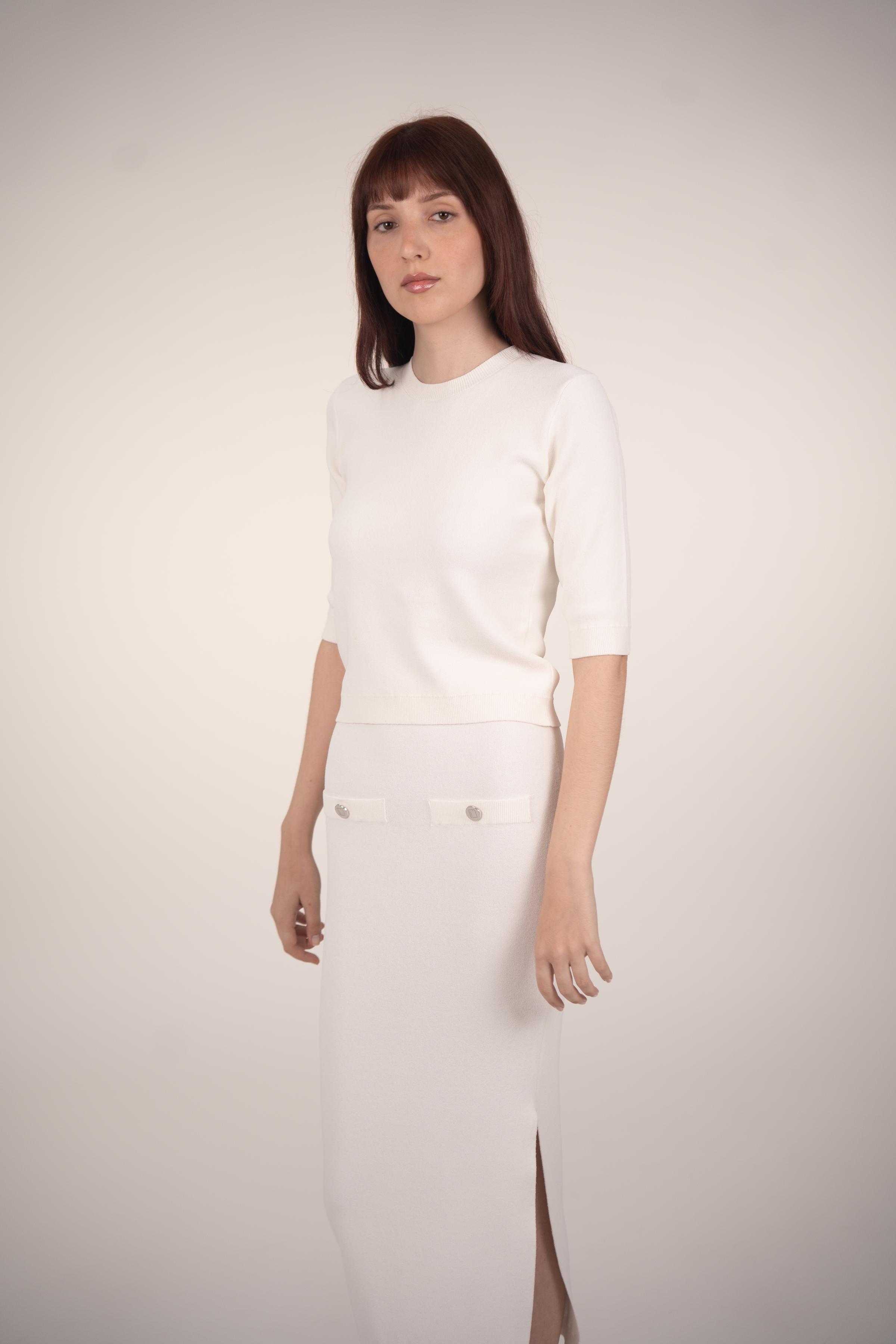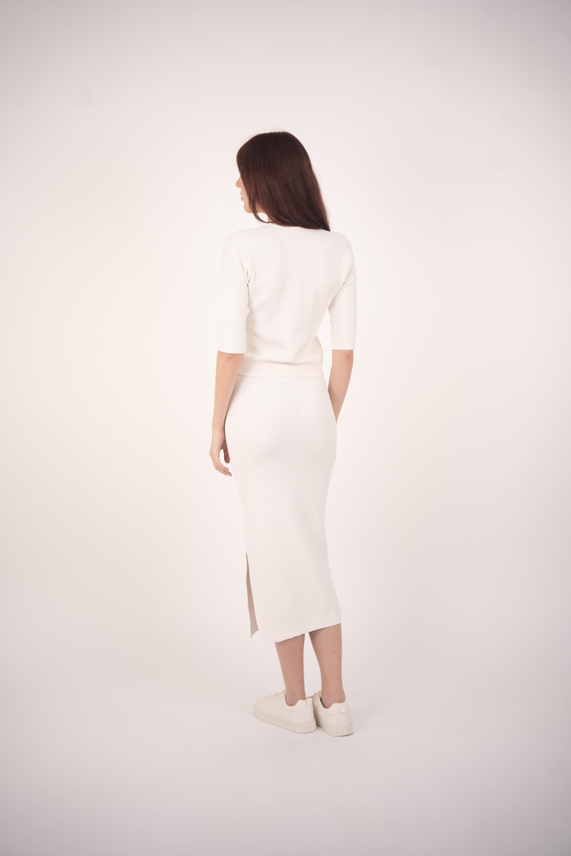 Transform your wardrobe with our Viscose Midi Skirt in white color. Each detail speaks of sophistication, from the shimmering silver buttons embellished with our brand’s iconic logo to the meticulous craftsmanship of the premium materials. Comprising 83% Matte Viscose and 17% Elite Polyester, this skirt promises both comfort and style. The finest Jolie Crep yarn adds elegance, ensuring you exude confidence with every wear. Versatile for any occasion, from casual gatherings to semi-formal events, our Viscose Midi Skirt seamlessly blends timeless charm with contemporary allure.