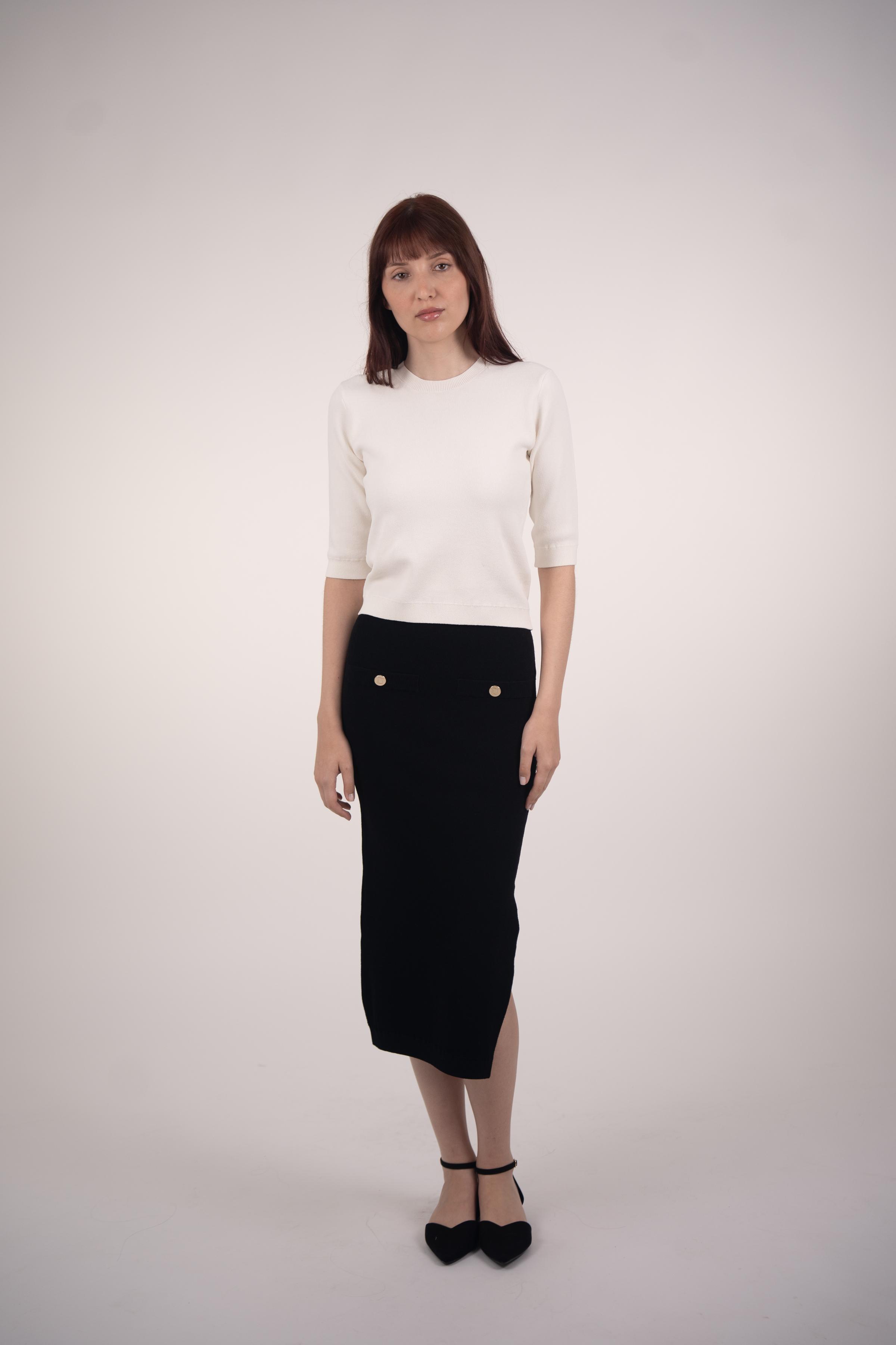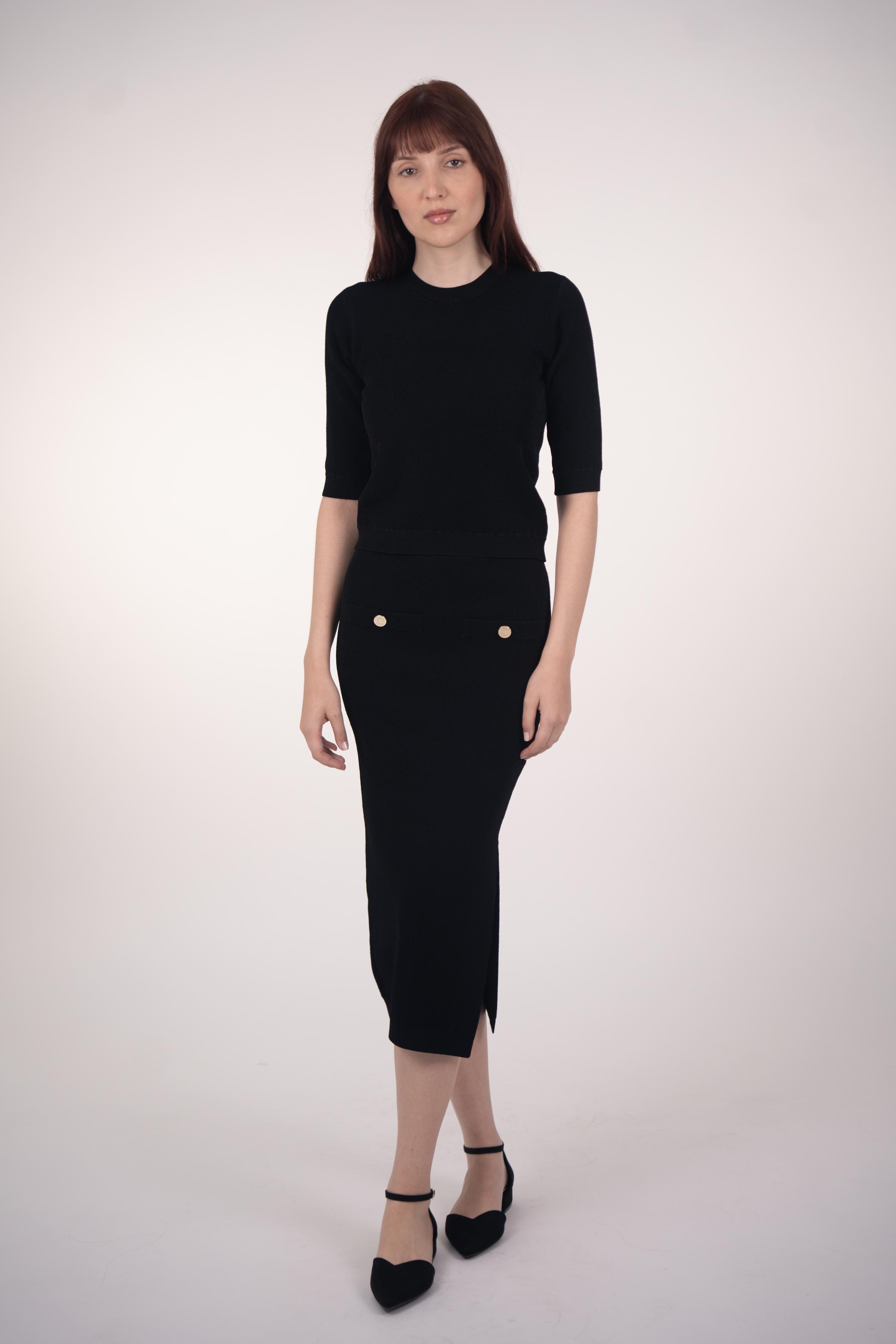 Elevate your ensemble with our Viscose Midi Skirt in black color, featuring exquisite golden buttons adorned with the raised logo of our brand.