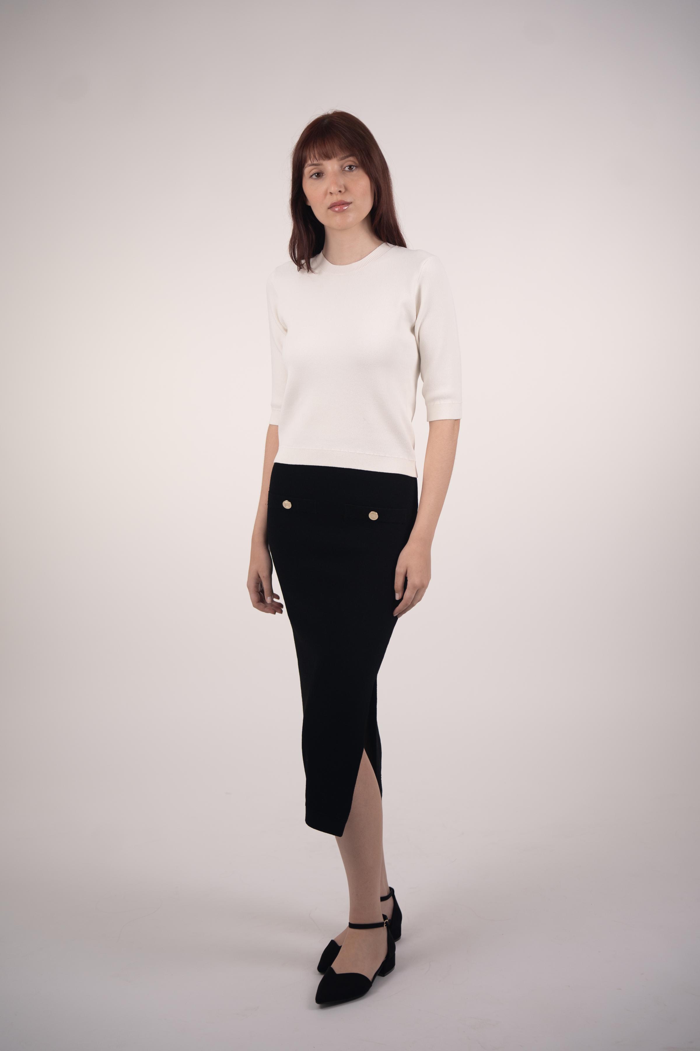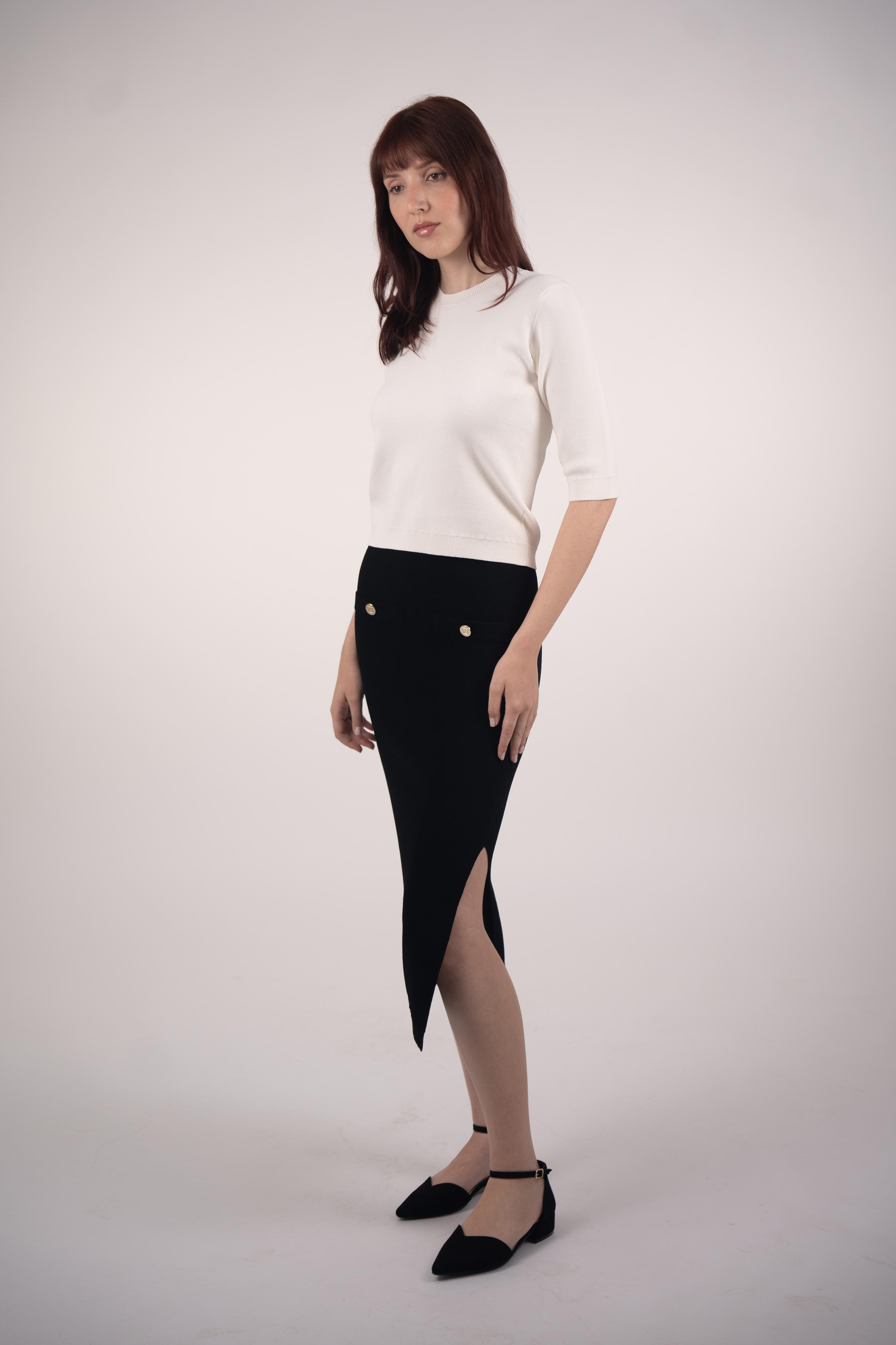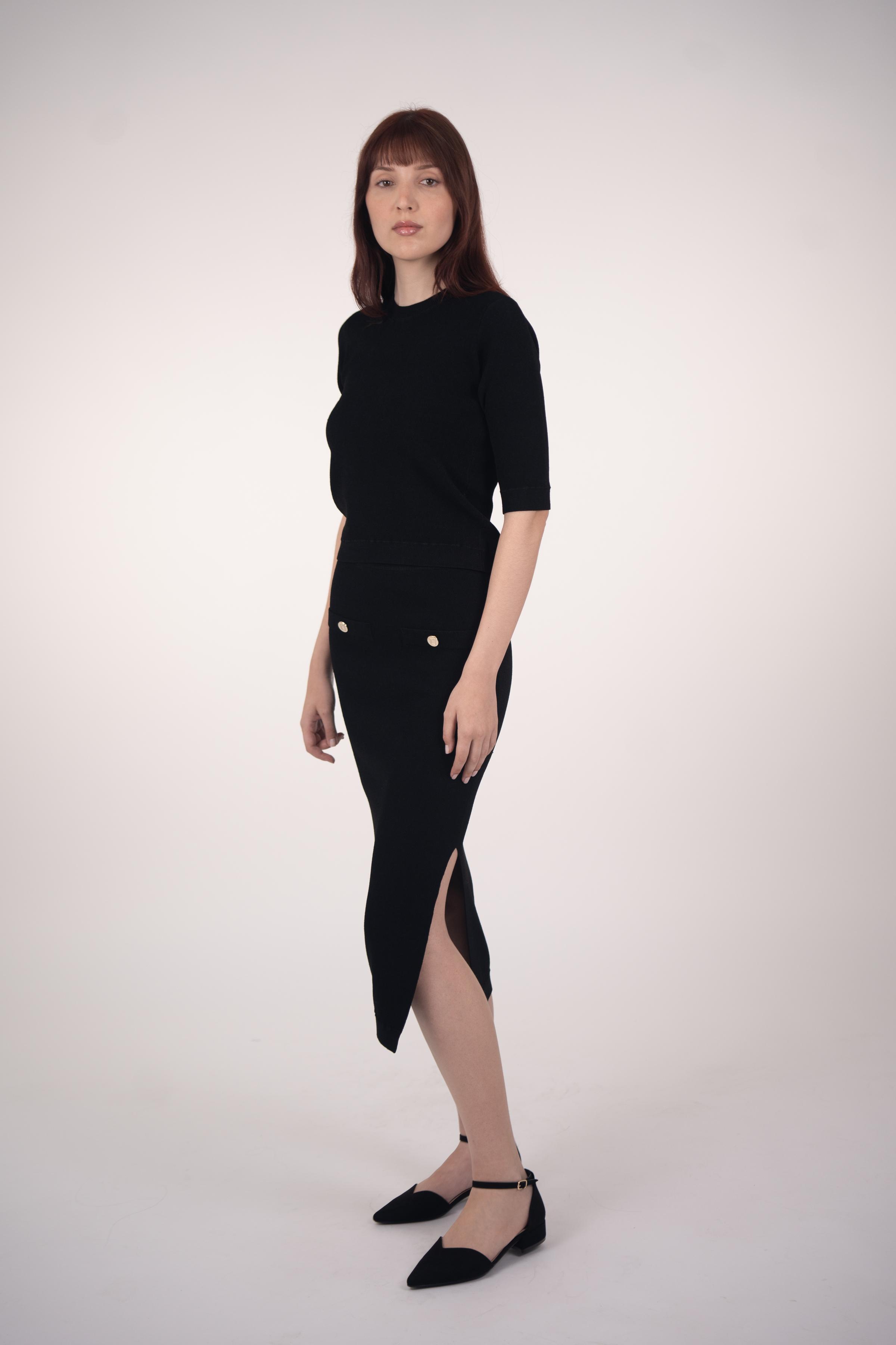 Elevate your ensemble with our Viscose Midi Skirt in black color, featuring exquisite golden buttons adorned with the raised logo of our brand. Meticulously crafted from premium materials, including 83% Matte Viscose and 17% Elite Polyester, this skirt offers unmatched comfort and style. The finest Jolie Crep yarn adds elegance, ensuring you make a statement with every step. Whether for casual outings or semi-formal occasions, our Viscose Midi Skirt effortlessly blends classic sophistication with modern allure.