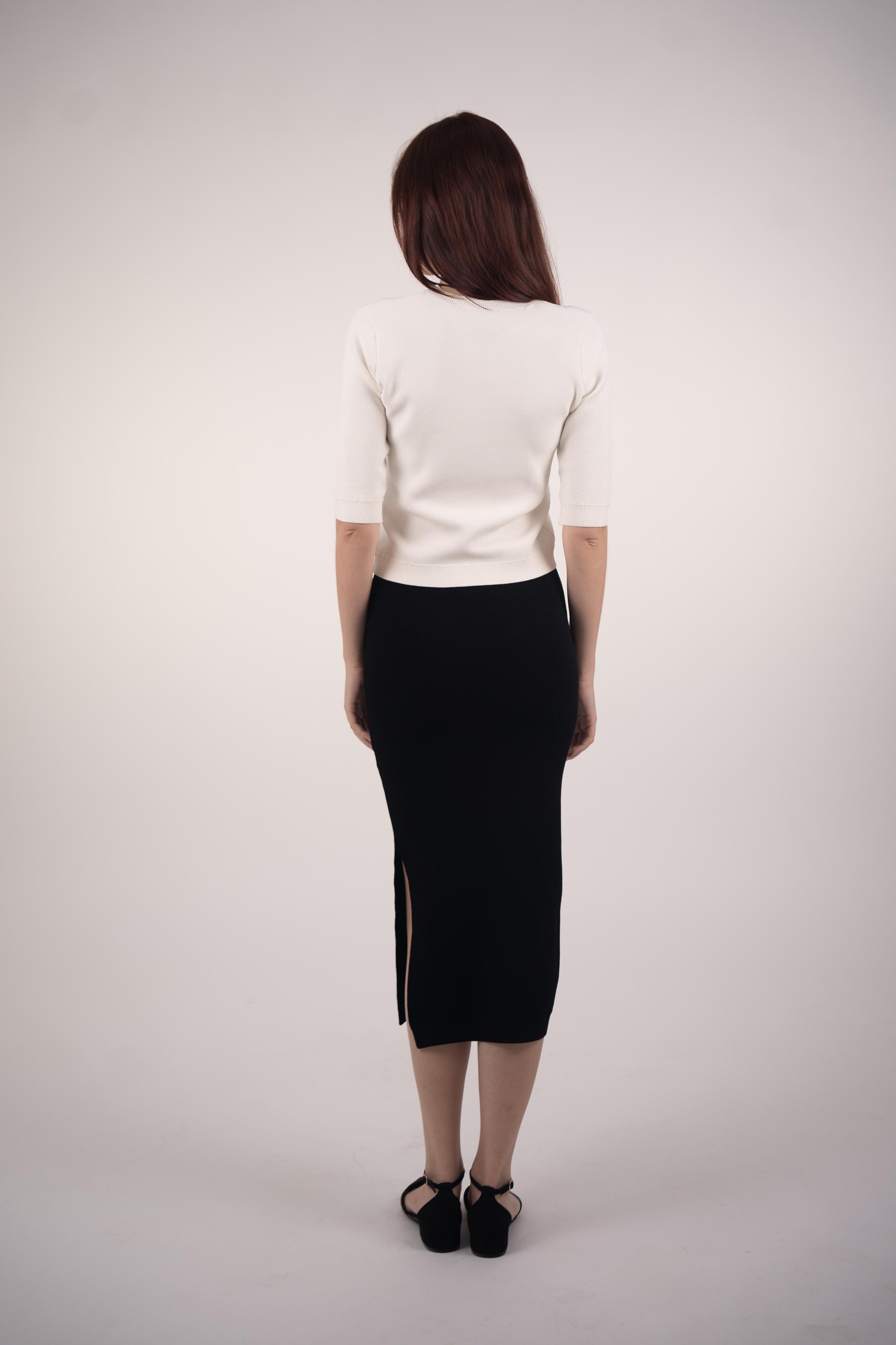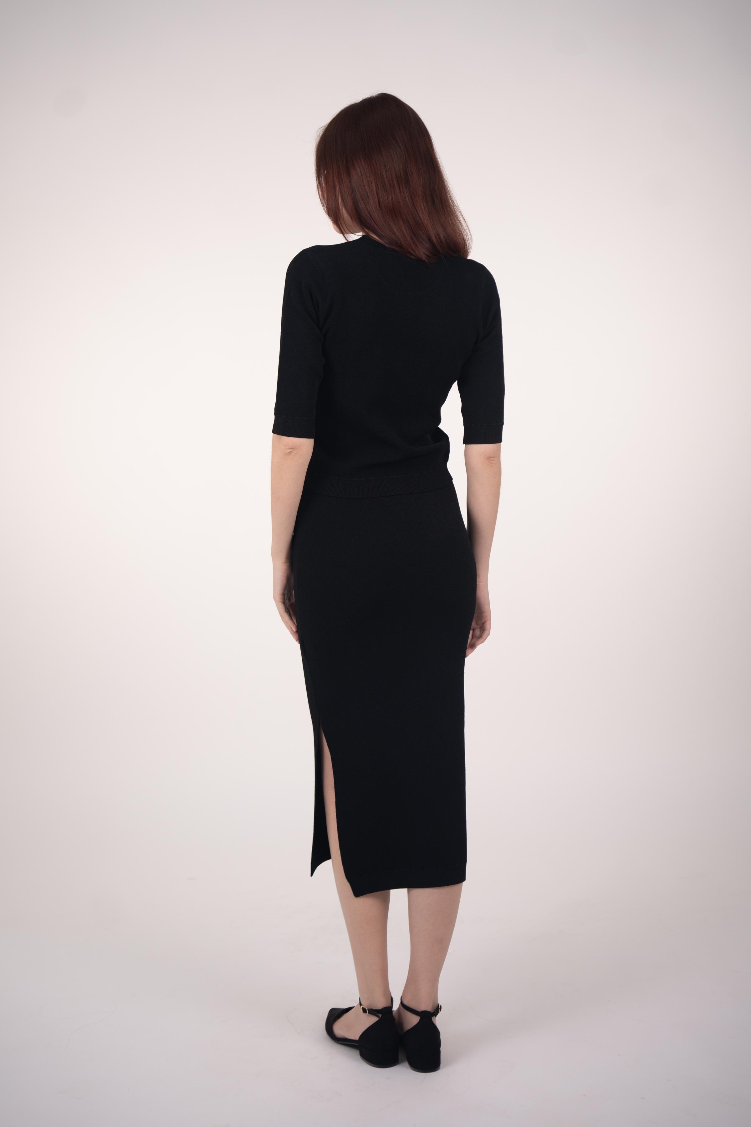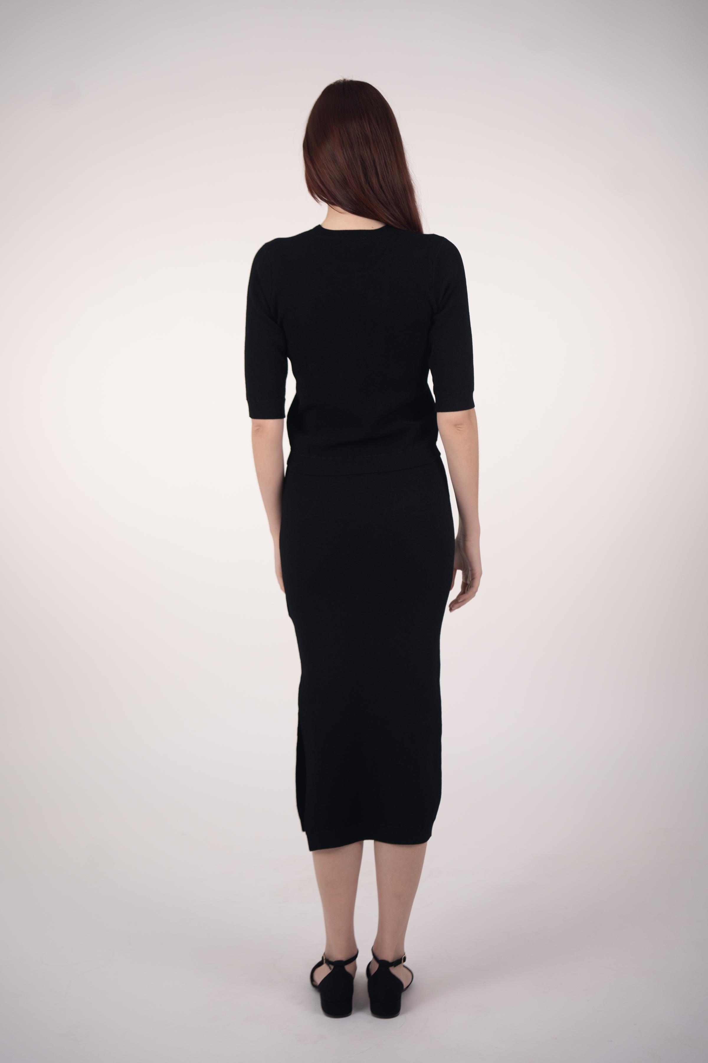 Elevate your ensemble with our Viscose Midi Skirt in black color, featuring exquisite golden buttons adorned with the raised logo of our brand. Meticulously crafted from premium materials, including 83% Matte Viscose and 17% Elite Polyester, this skirt offers unmatched comfort and style. The finest Jolie Crep yarn adds elegance, ensuring you make a statement with every step. Whether for casual outings or semi-formal occasions, our Viscose Midi Skirt effortlessly blends classic sophistication with modern allure.