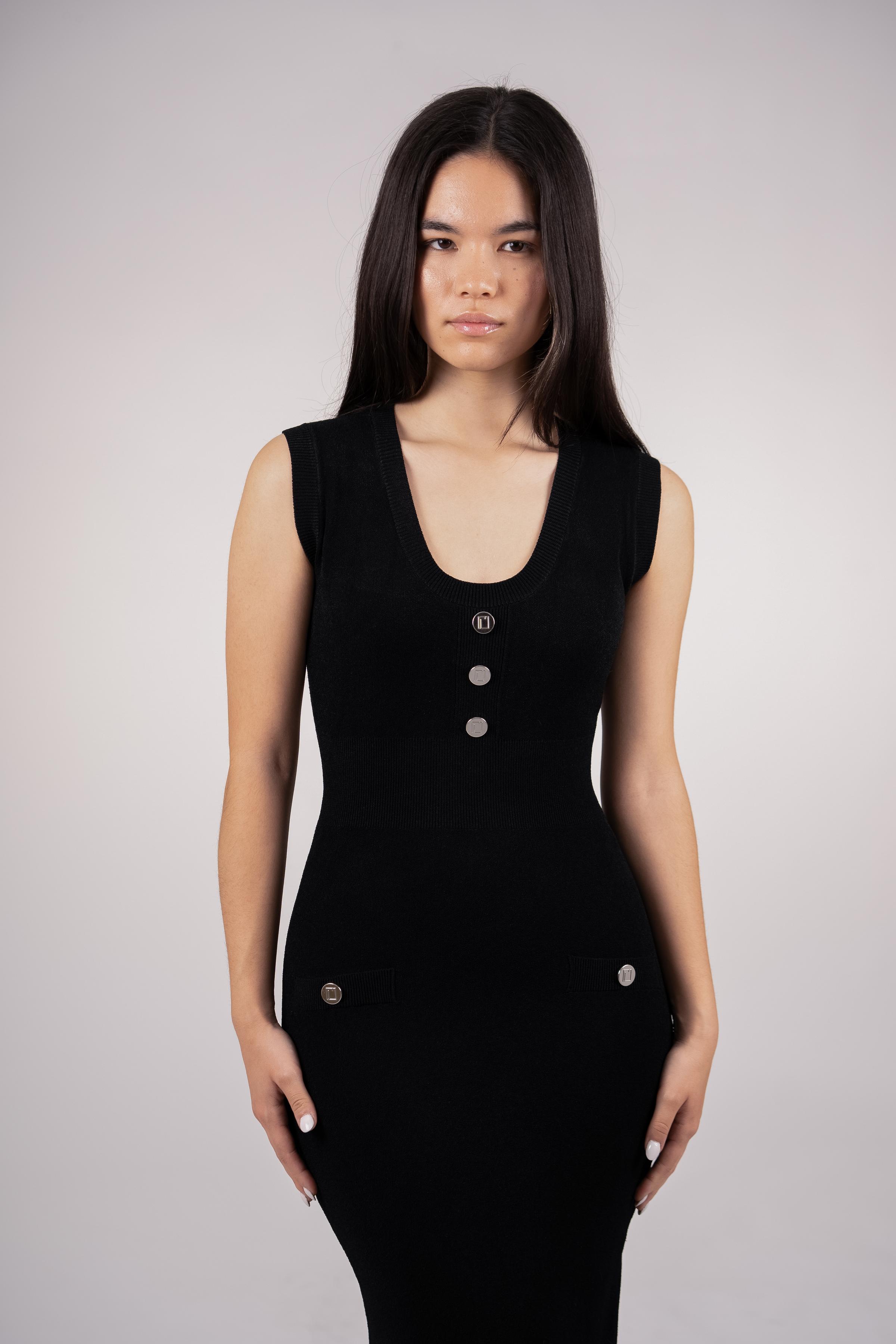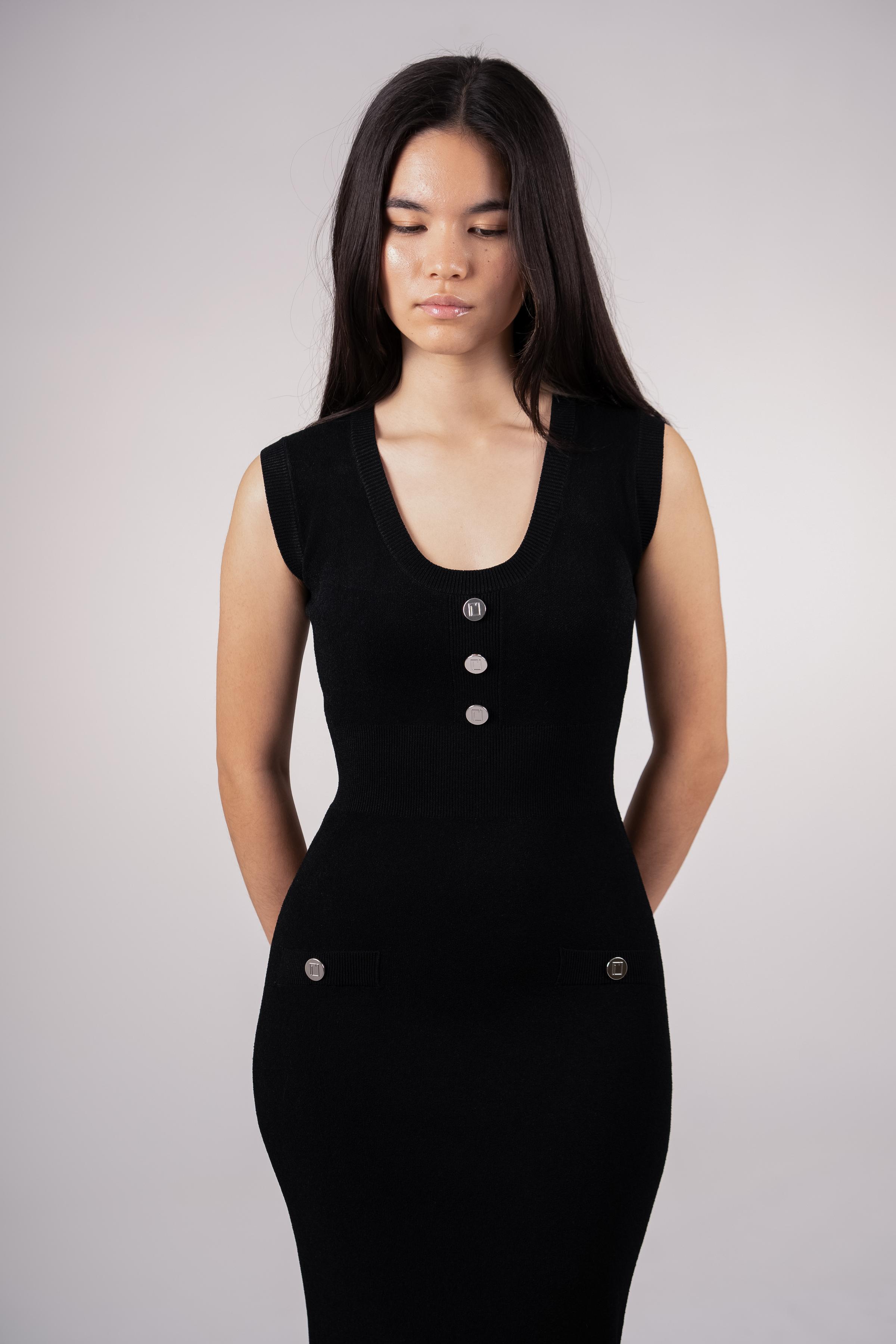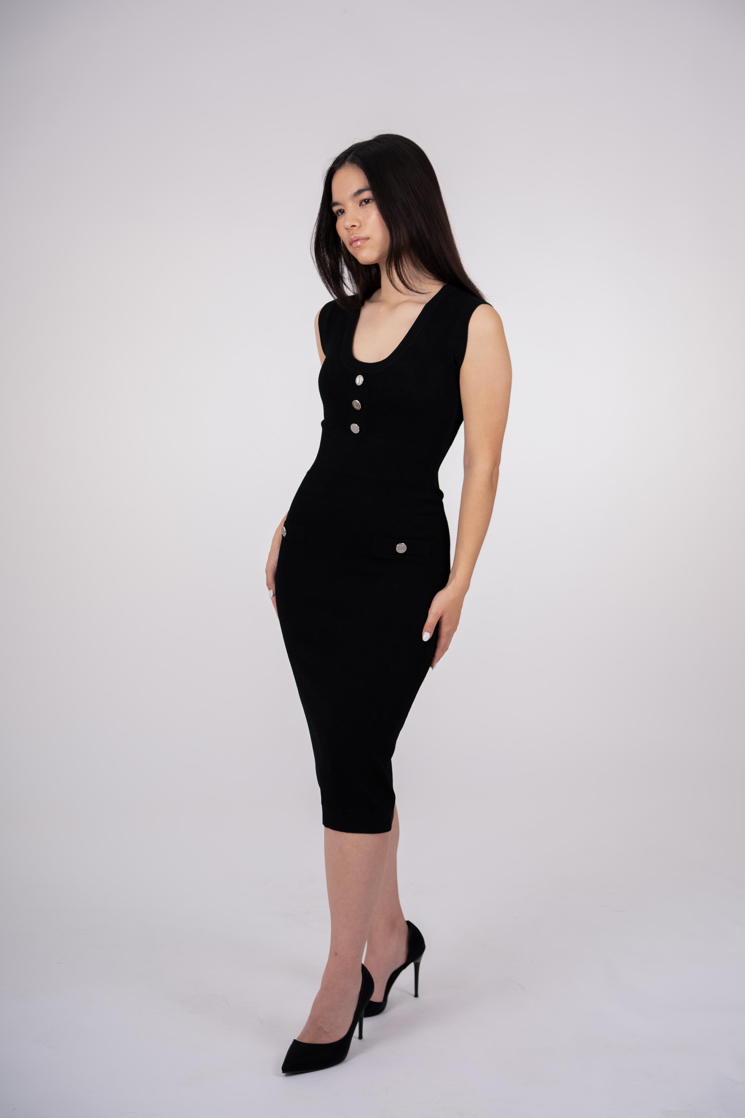 Step into elegance with our black midi knit dress, featuring exquisite silver buttons that enhance its refined design. Crafted with precision from top-quality materials, this dress combines 83% matte viscose and 17% Elite polyester for unparalleled comfort and style. Made in Portugal, with the highest quality Italian Jolie Crep yarn.