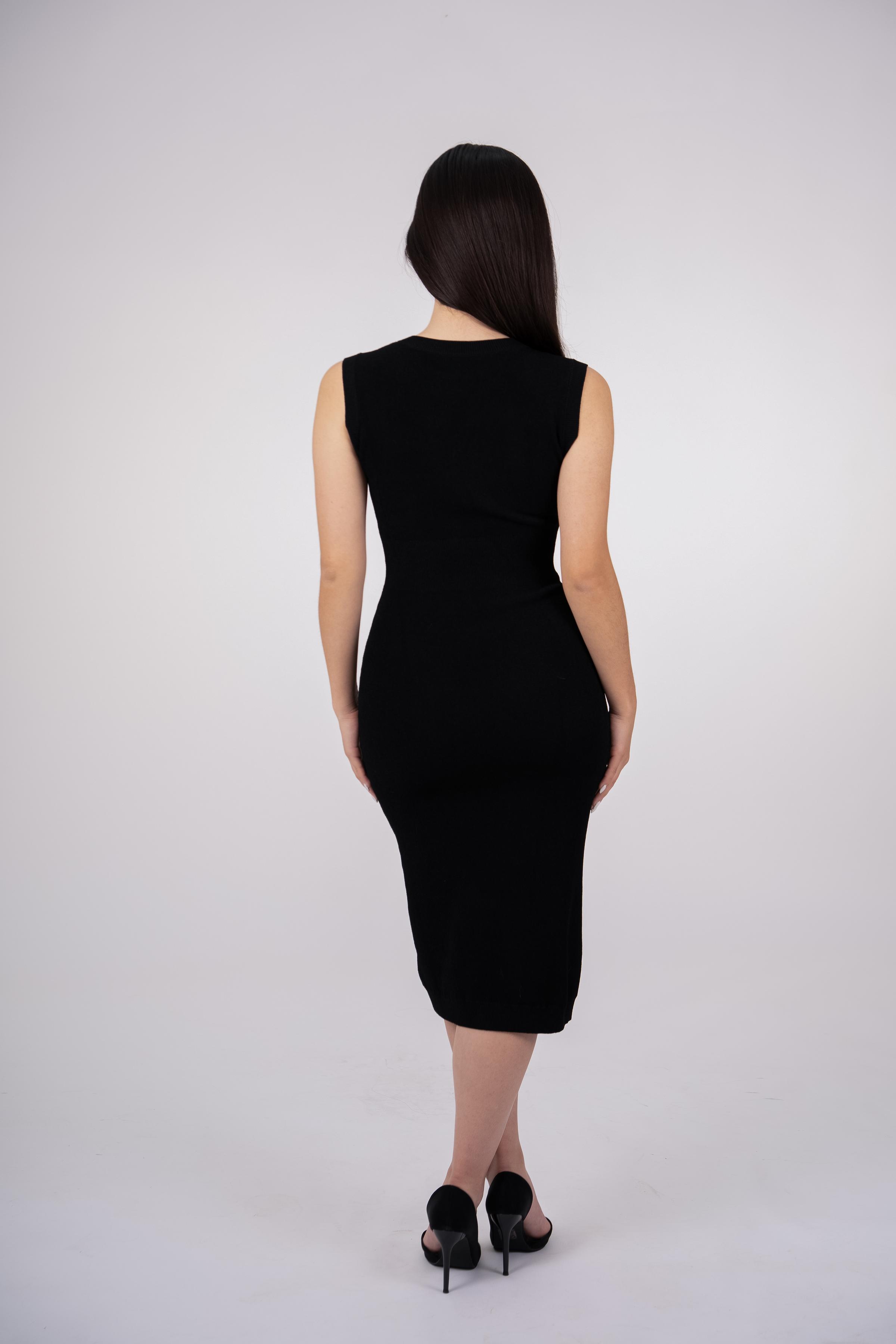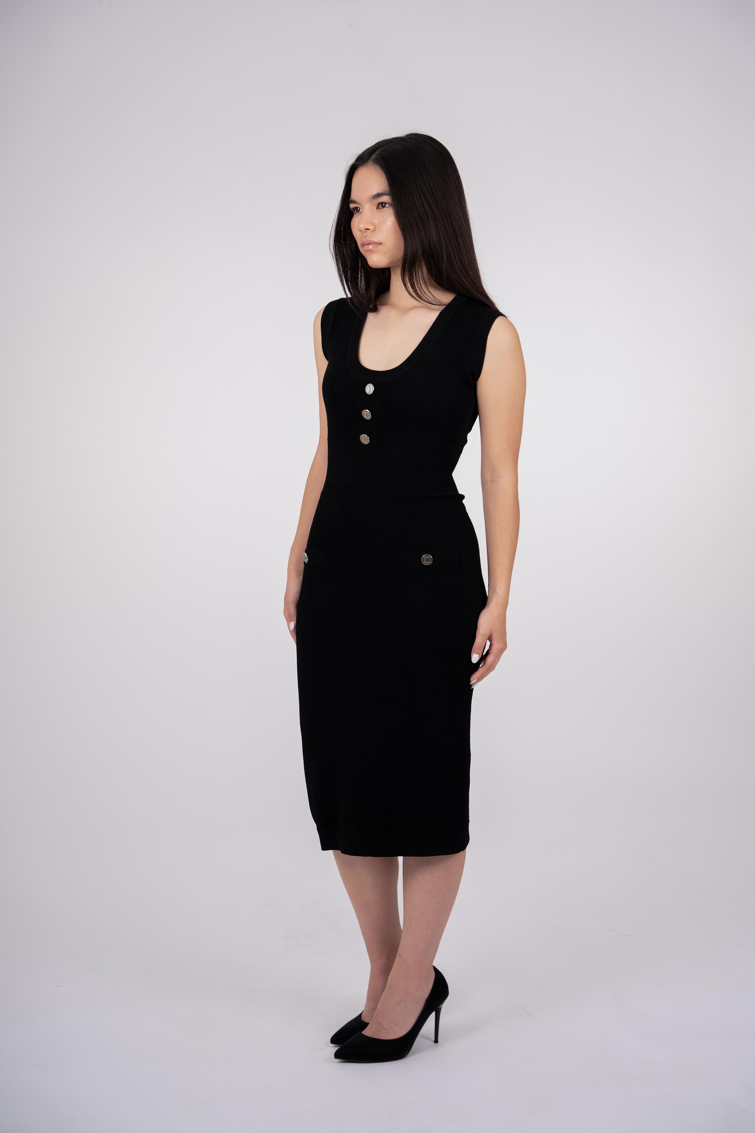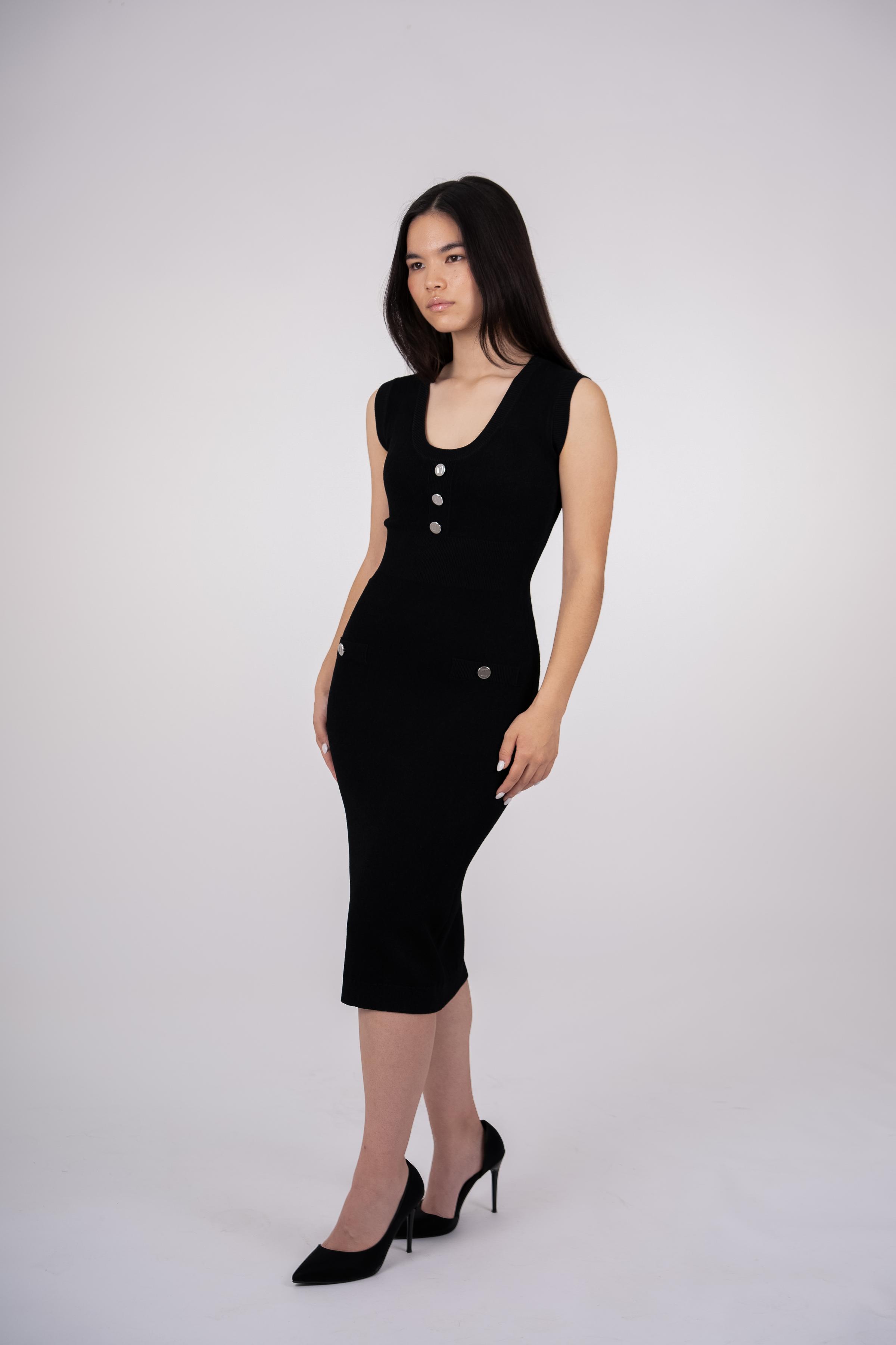 Step into elegance with our black midi knit dress, featuring exquisite silver buttons that enhance its refined design. Crafted with precision from top-quality materials, this dress combines 83% matte viscose and 17% Elite polyester for unparalleled comfort and style. Made in Portugal, with the highest quality Italian Jolie Crep yarn.