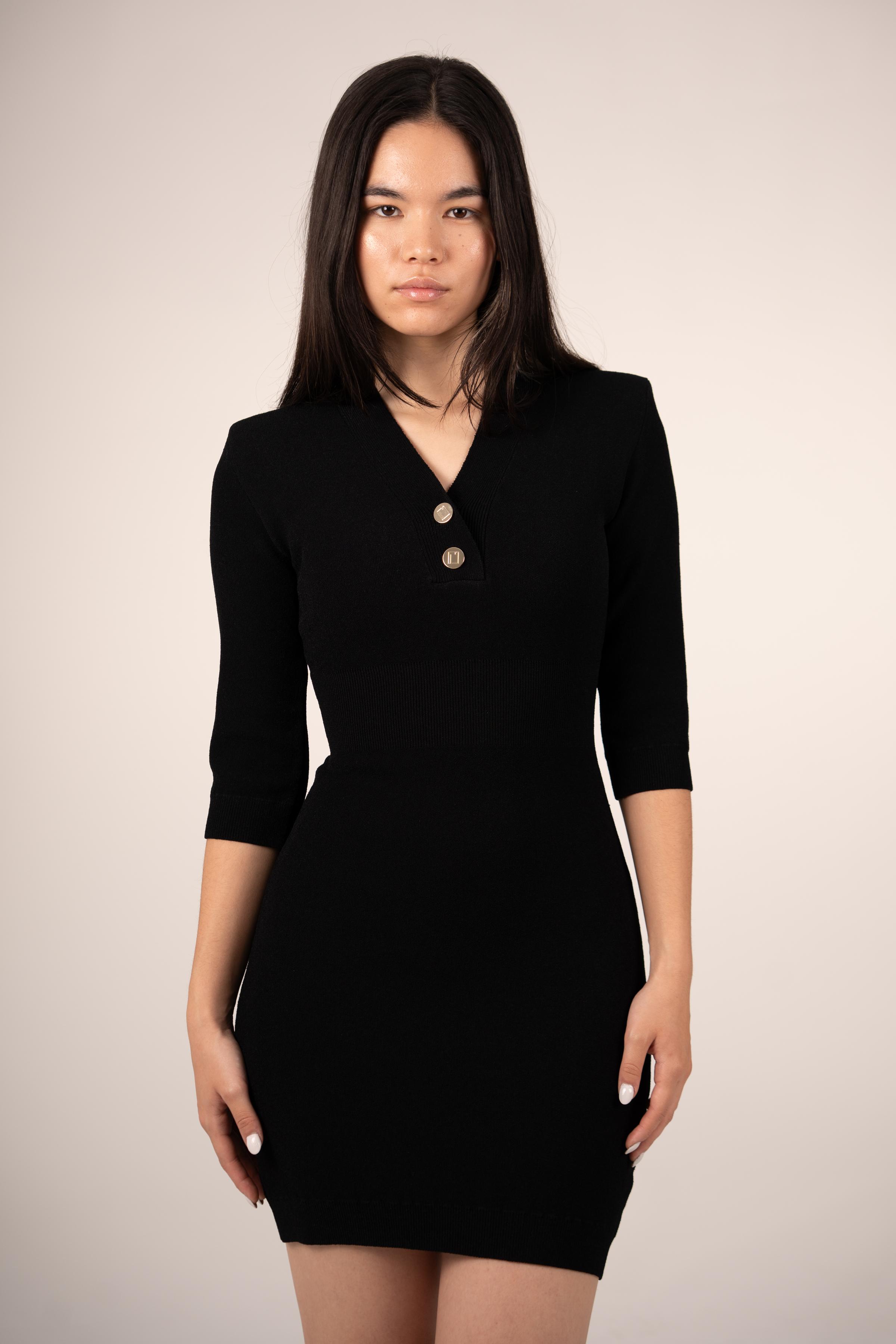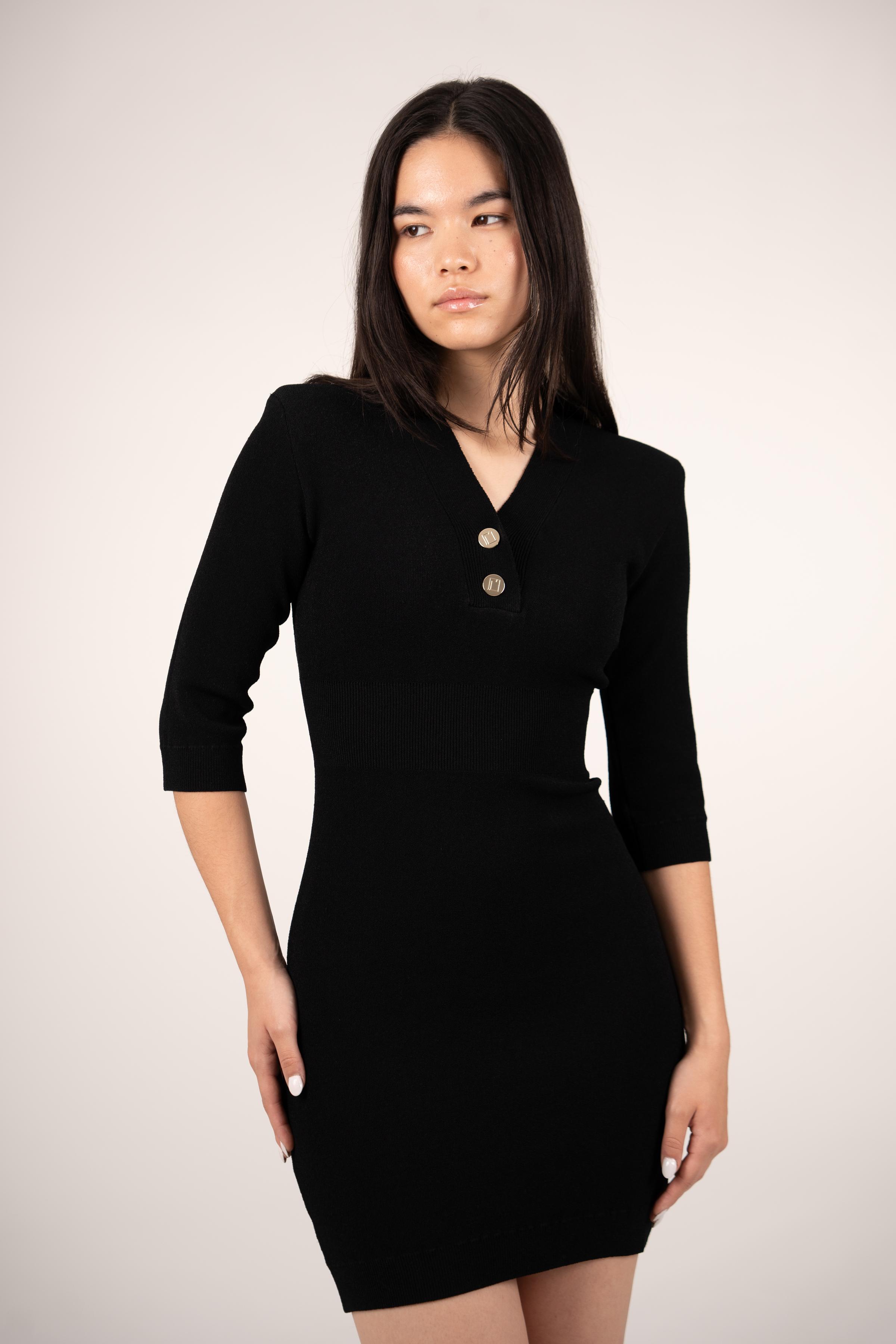 Adéntrate en la elegancia con nuestro vestido mini de punto en color negro, que presenta exquisitos botones dorados que realzan su diseño refinado. Confeccionado con precisión a partir de materiales premium, este vestido combina 83% viscosa mate y 17% poliéster Elite para un confort y estilo inigualables. El mejor hilo Jolie Crep realza su distinción, asegurando que irradies sofisticación en cada uso. Perfecto para cualquier ocasión, desde reuniones informales hasta eventos formales, nuestro vestido mini negro fusiona sin esfuerzo el encanto atemporal con un toque contemporáneo.